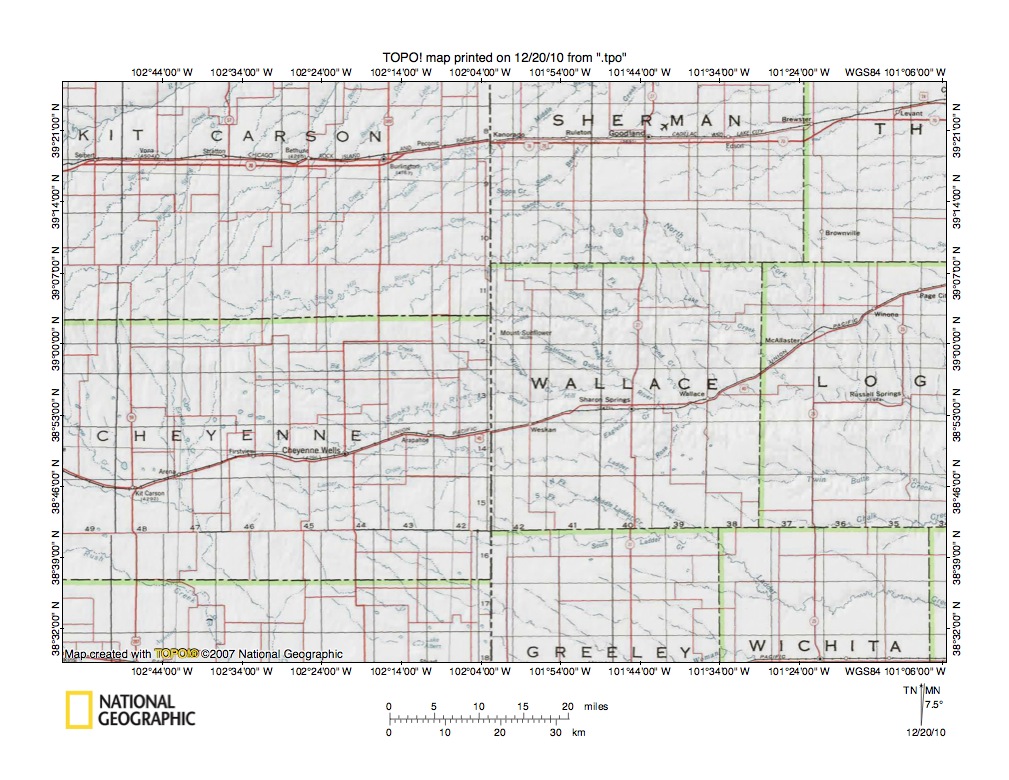 Figure 2: Slightly more detailed regional map (than figure 1) showing west end of Smoky Hill River drainage basin in Kit Carson and Cheyenne Counties, Colorado and Sherman and Wallace Counties, Kansas. United States Geological Survey map digitally presented using National Geographic Society TOPO software.