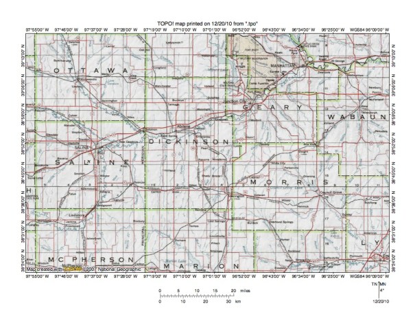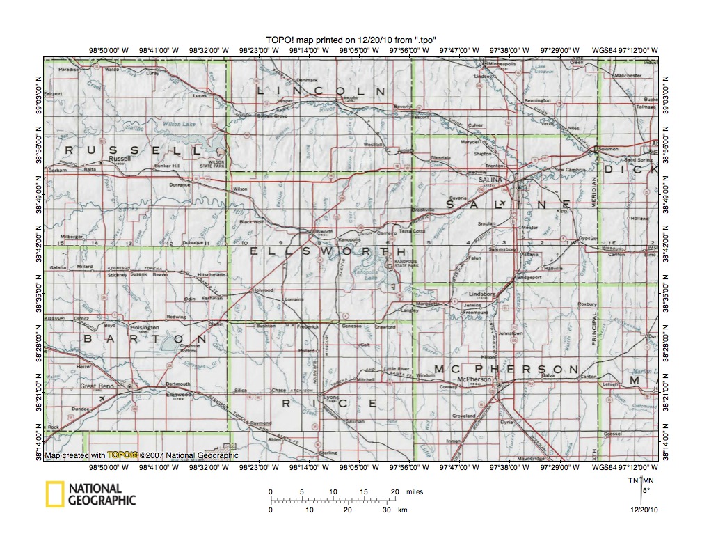 Figure 4: Slightly more detailed regional map (than figure 1) showing convergence of Saline, Solomon, Republican, and Smoky Hill Rivers to form east-oriented Kansas River. United States Geological Survey map digitally presented using National Geographic Society TOPO software.