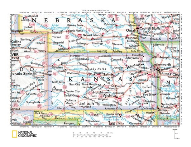 Figure 1: Smoky Hill River drainage basin location map (select and click on maps to enlarge). National Geographic Society map digitally presented using National Geographic Society TOPO software.