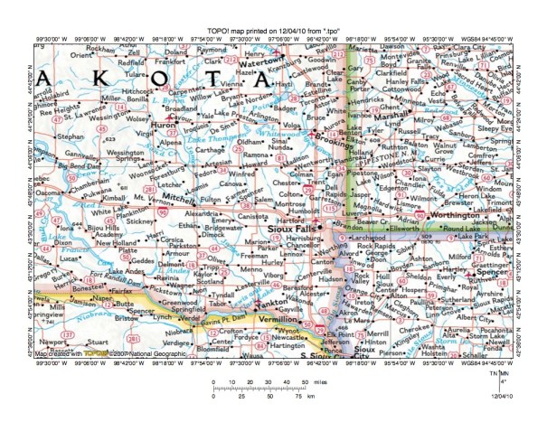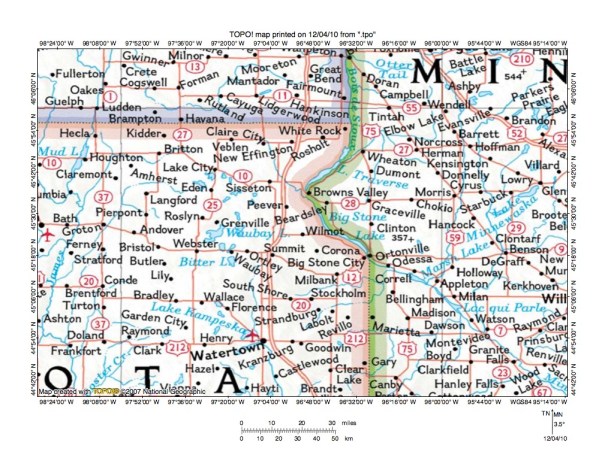 Figure 2: Regional map illustrating drainage routes in northeast South Dakota, a strip of southeast North Dakota, and an area in western Minnesota. The Big Sioux River is the unlabeled stream flowing through Watertown, South Dakota (near south center edge). National Geographic Society map digitally presented using National Geographic Society TOPO software.