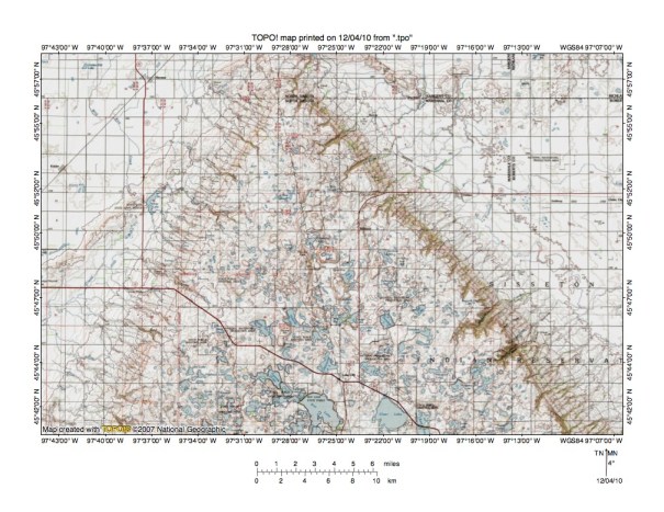 Figure 3: North end of Prairie Coteau upland surface. Further south the Prairie Coteau upland surface is drained by the south-oriented Big Sioux River. West-facing escarpment drains to Wild Rice River, which drains eventually to Hudson Bay. Further south the west-facing escarpment drains to the south-oriented James River. Northeast-facing escarpment drains to southeast-oriented Minnesota River. United States Geological Survey map digitally presented using National Geographic Society TOPO software.