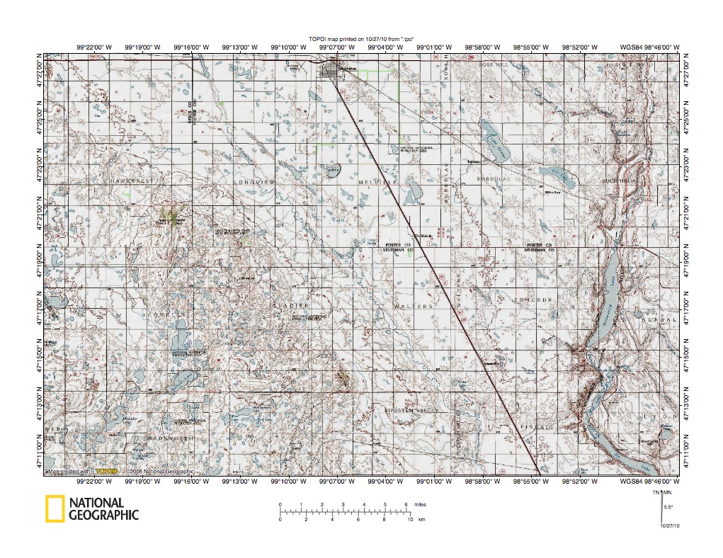 Figure 4: Missouri Escarpment and James River valley south of Carrington, North Dakota. James River flows south along the figure 4 east edge. The south-southeast oriented stream flowing along the Missouri Escarpment base is Pipestone Creek, which is a James River tributary. The parallel and south-oriented Sheyenne River in this region is located about 50 kilometers east of the south-oriented James River. United States Geological Survey map digitally presented using National Geographic Society TOPO software.