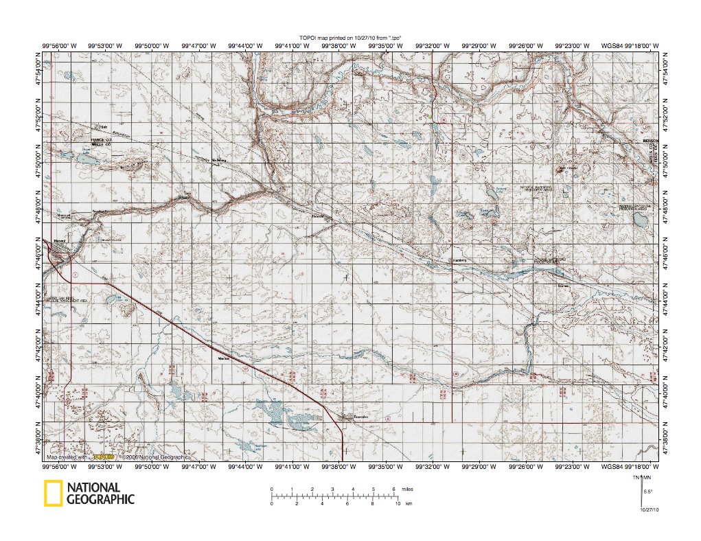 Figure 2: James River headwaters area in central North Dakota. Northeast-facing Missouri Escarpment can be seen in figure 2 west half and Missouri Coteau is the upland region south and west of the Escarpment. The James River flows in a northeast direction from southwest corner area and then north to the figure 2 north edge where it turns to flow in a southeast, east, and north direction to the figure 2 northeast corner area. United States Geological Survey map digitally presented using National Geographic Society TOPO software.