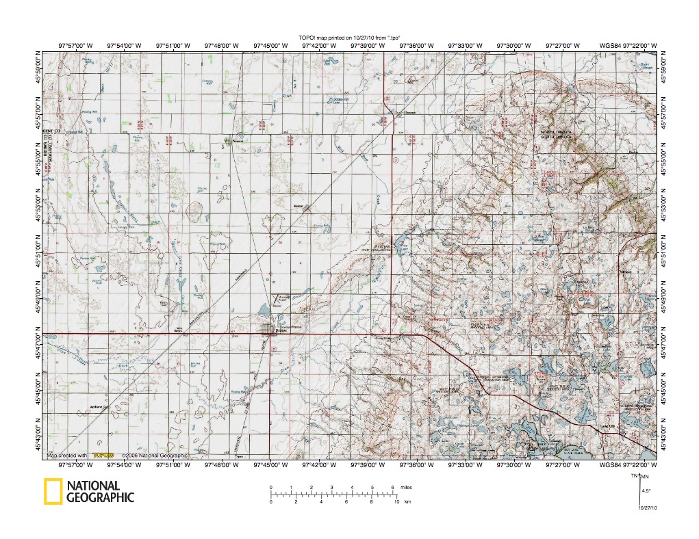 Figure 7: West margin of James River lowland west of the figure 6 map area showing east-facing Missouri Escarpment and the Missouri Coteau upland surface west of the Missouri Escarpment crest. The west-to east oriented North Dakota-South Dakota state line is located about 5 miles south of the north edge. The south-oriented James River is located east of the figure 7 map area and west of the figure 6 map area. United States Geological Survey map digitally presented using National Geographic Society TOPO software.