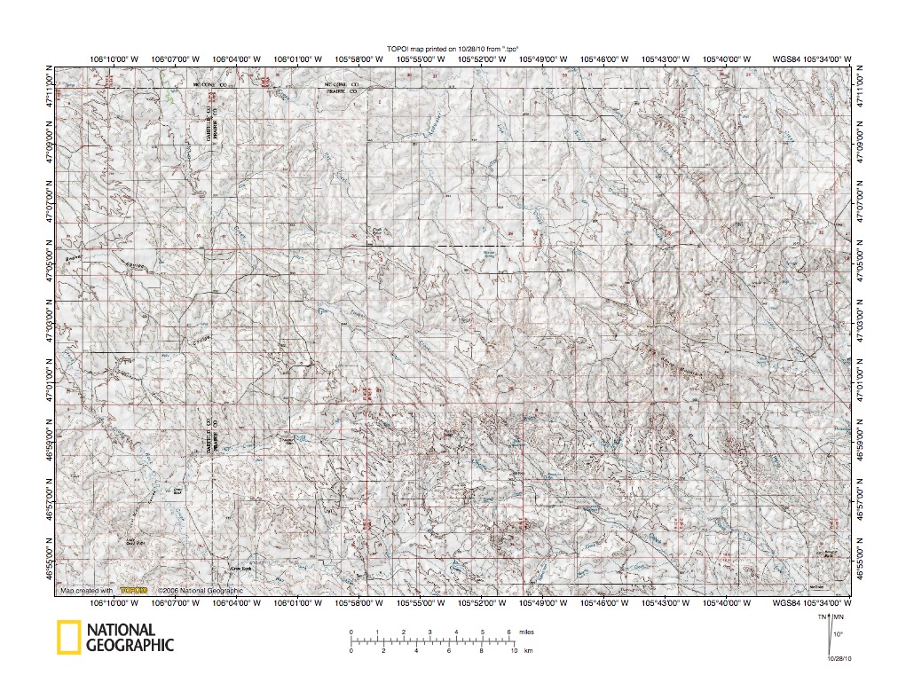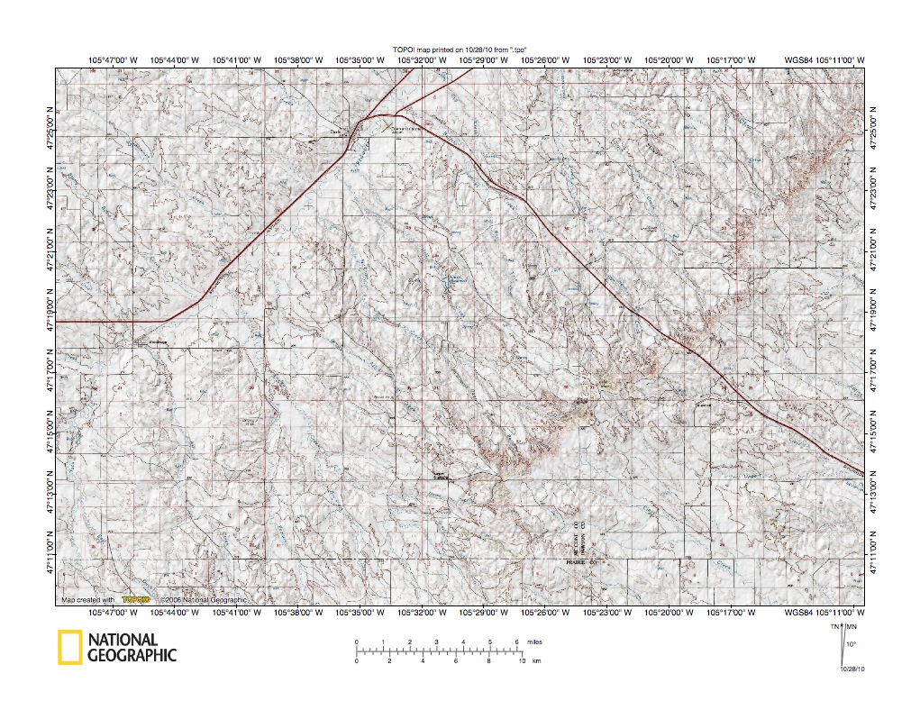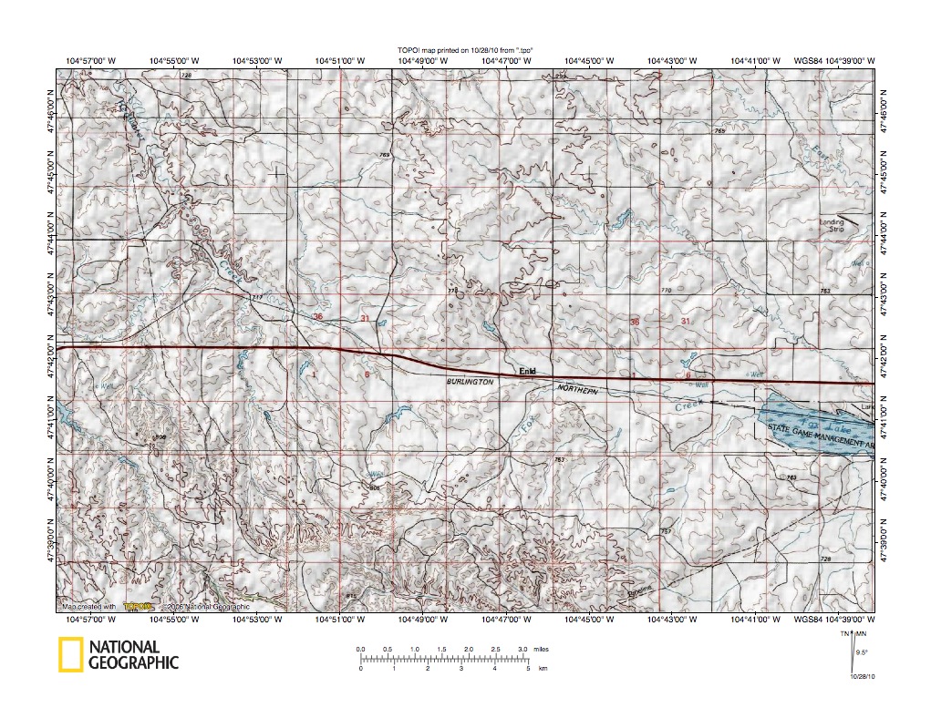 Figure 3: Southwest end of northeast-oriented Redwater River drainage basin. Northeast-oriented Redwater River is located in figure 3 north center area. Northwest-oriented streams in figure 3 west half flow to north-oriented Big Dry Creek, which flows to east-oriented Missouri River. Southeast-oriented streams in figure 3 east half flow to northeast-oriented Yellowstone River. United States Geological Survey map digitally presented using National Geographic Society TOPO software.