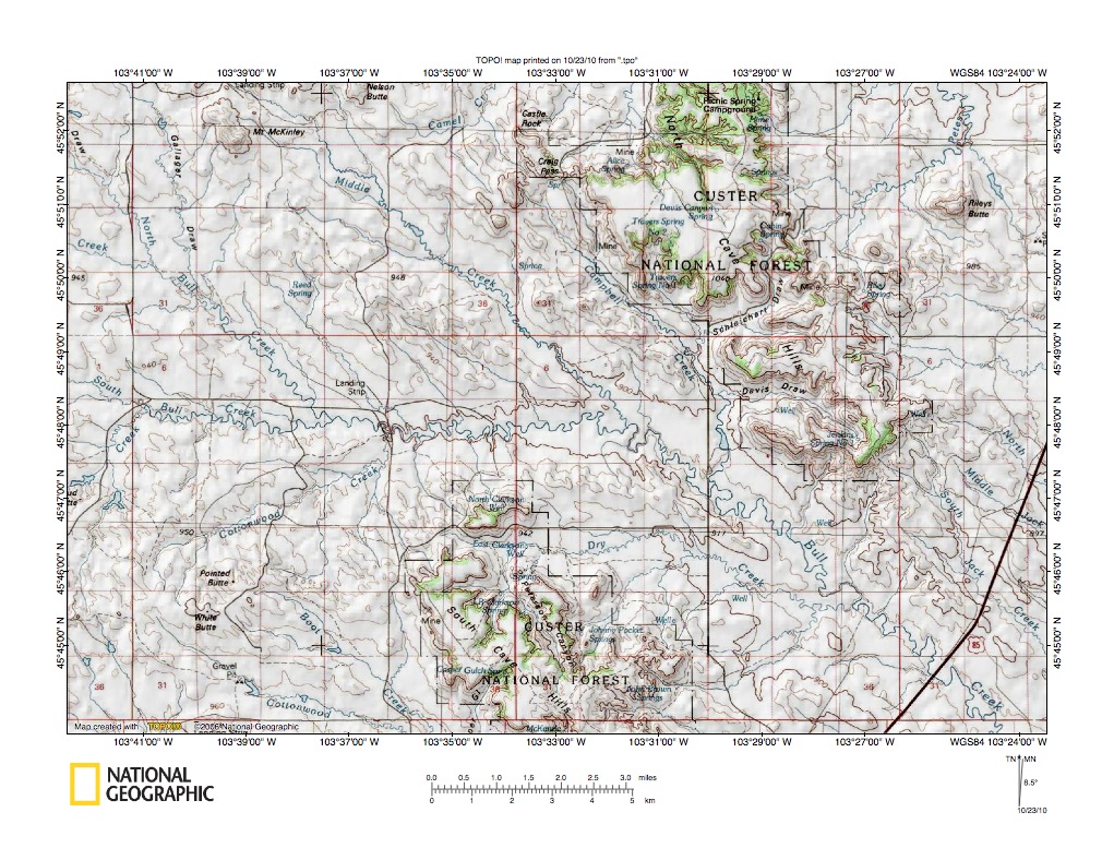Figure 4: Bull Creek valley eroded across the Cave Hills. Bull Creek is a southeast-oriented South Fork Grand River tributary and separates the North Cave Hills from the South Cave Hills. United States Geological Survey map digitally presented using National Geographic Society TOPO software.