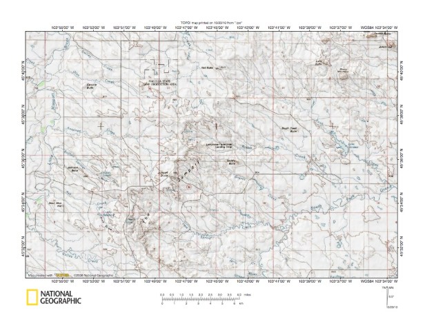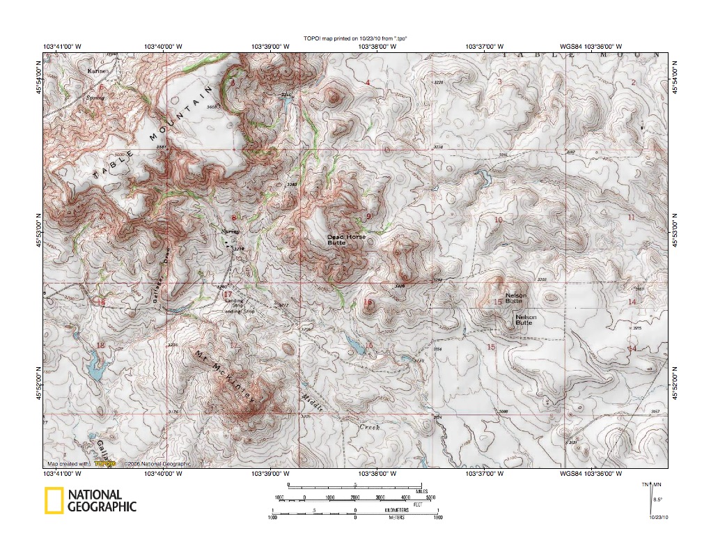 Figure 2: Little Missouri River-North Fork Grand River drainage divide area. United States Geological Survey map digitally presented using National Geographic Society TOPO software.