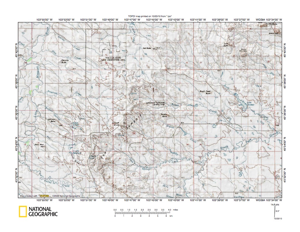 Figure 6: Little Missouri River-South Fork Grand River drainage divide at “The Jumpoff”. United States Geological Survey map digitally presented using National Geographic Society TOPO software.
