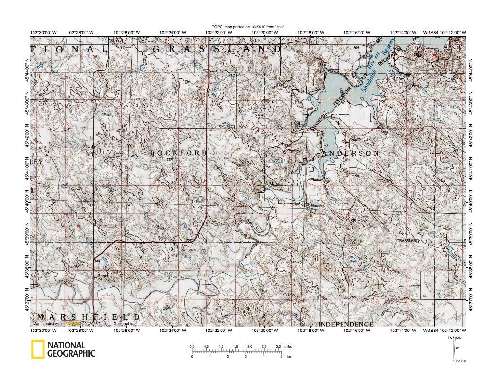 Figure 3: East and northeast-oriented South Fork Grand River flowing into Shadehill Reservoir where the South Fork Grand River joins the North Fork Grand River to form the east and southeast-oriented Grand River. United States Geological Survey map digitally presented using National Geographic Society TOPO software.
