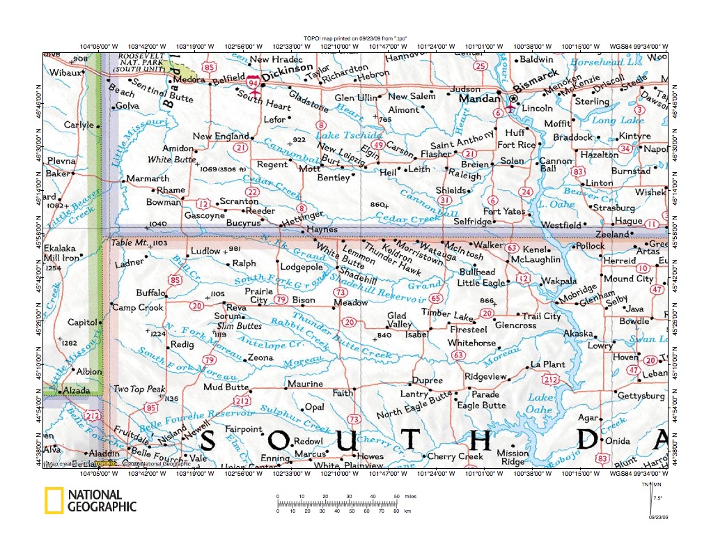 Figure 1: Southwest North Dakota and northwest South Dakota Grand River drainage basin location map. National Geographic Society map digitally presented using National Geographic Society TOPO software.