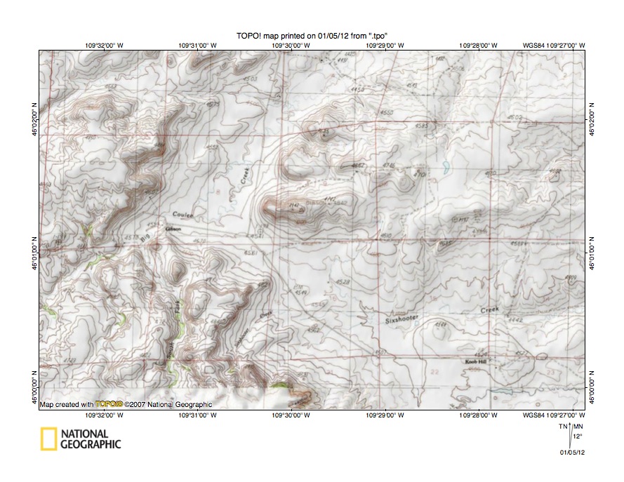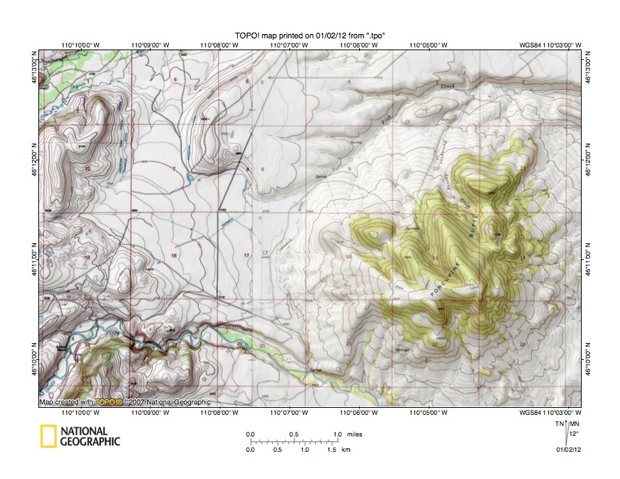 Figure 4: Detailed map of Fish Creek-Sweet Grass Creek drainage divide area west of Porcupine Butte. United States Geological Survey map digitally presented using National Geographic Society TOPO software.