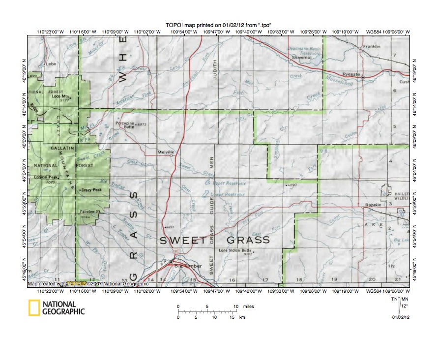 Figure 1: Fish Creek-Sweet Grass Creek drainage divide area location map (select and click on maps to enlarge). National Geographic Society map digitally presented using National Geographic Society TOPO software.