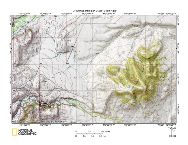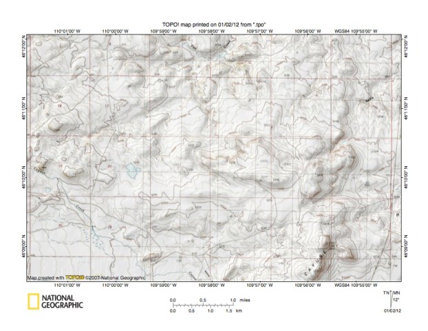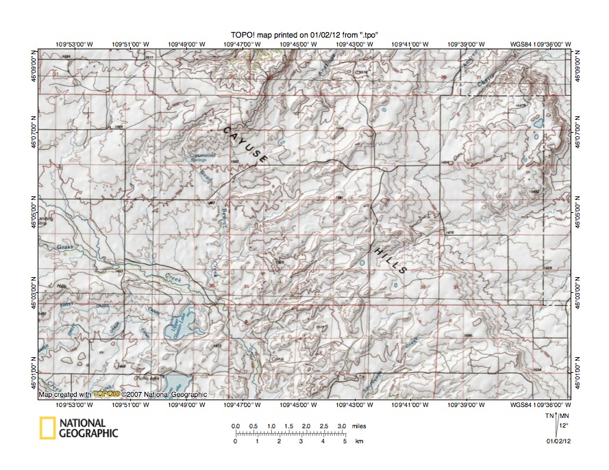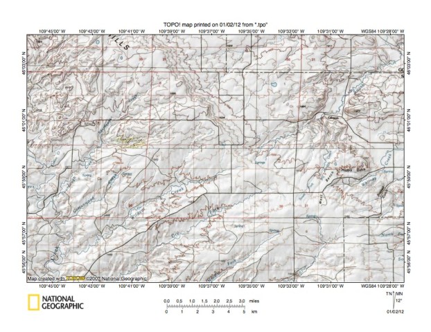 Figure 3: Fish Creek-Sweet Grass Creek drainage divide area west of Porcupine Butte. United States Geological Survey map digitally presented using National Geographic Society TOPO software.