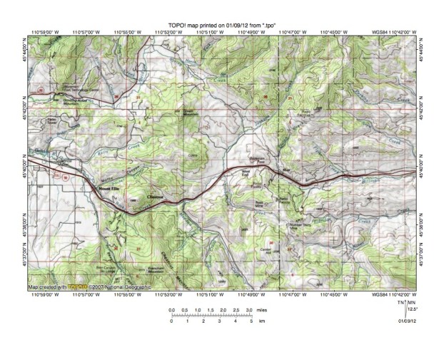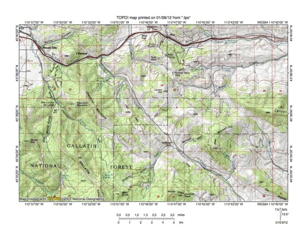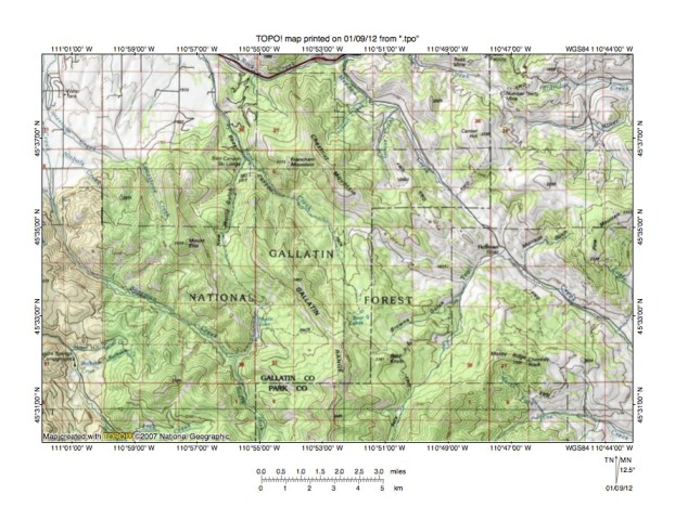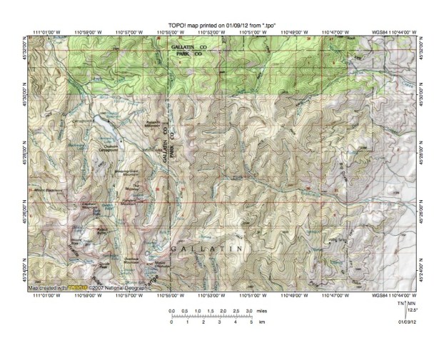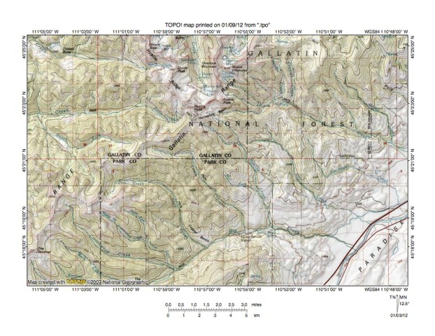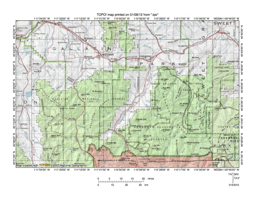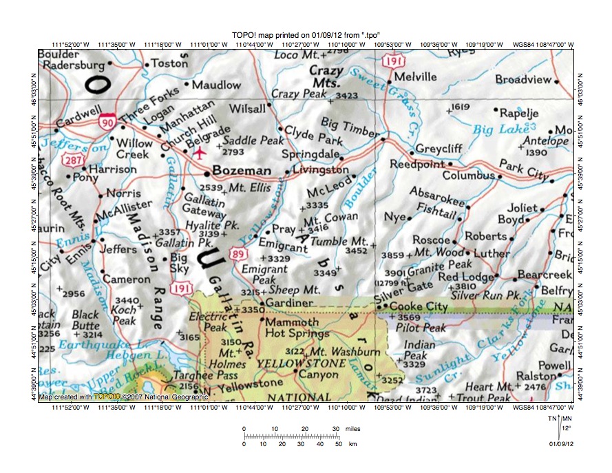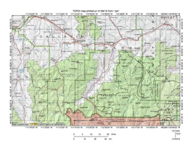 Figure 1: Gallatin River-Yellowstone River drainage divide area location map (select and click on maps to enlarge). National Geographic Society map digitally presented using National Geographic Society TOPO software.