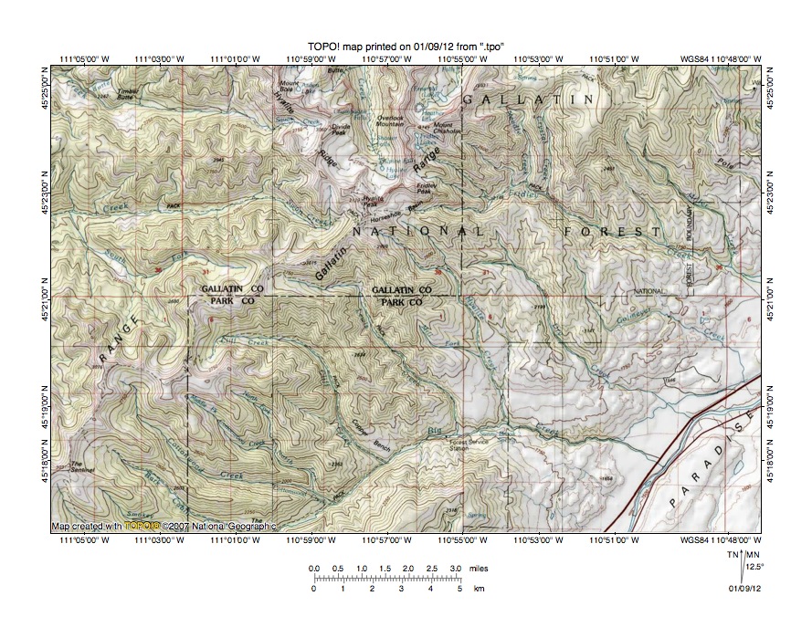 Figure 10: Hyalite Creek-Yellowstone River drainage divide area. United States Geological Survey map digitally presented using National Geographic Society TOPO software.