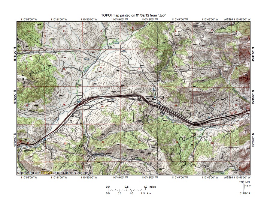 Figure 4: Detailed map of Jackson Creek-Billman Creek drainage divide area at Bozeman Pass. United States Geological Survey map digitally presented using National Geographic Society TOPO software.