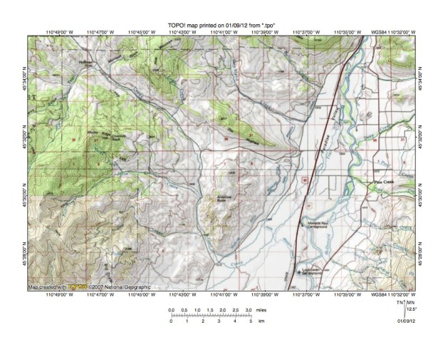 Figure 6: Trail Creek-Yellowstone River drainage divide area. United States Geological Survey map digitally presented using National Geographic Society TOPO software.