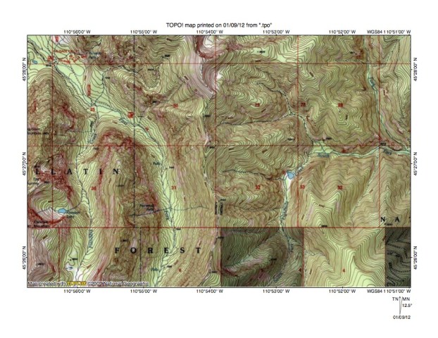Figure 7: Bear Creek-Trail Creek drainage divide area. United States Geological Survey map digitally presented using National Geographic Society TOPO software.