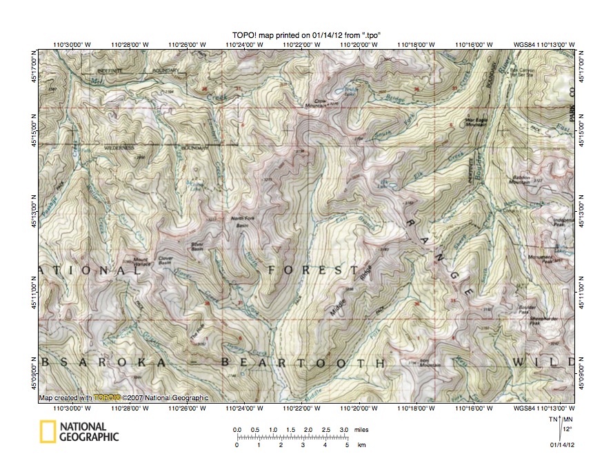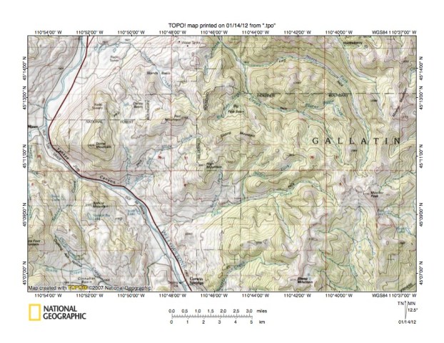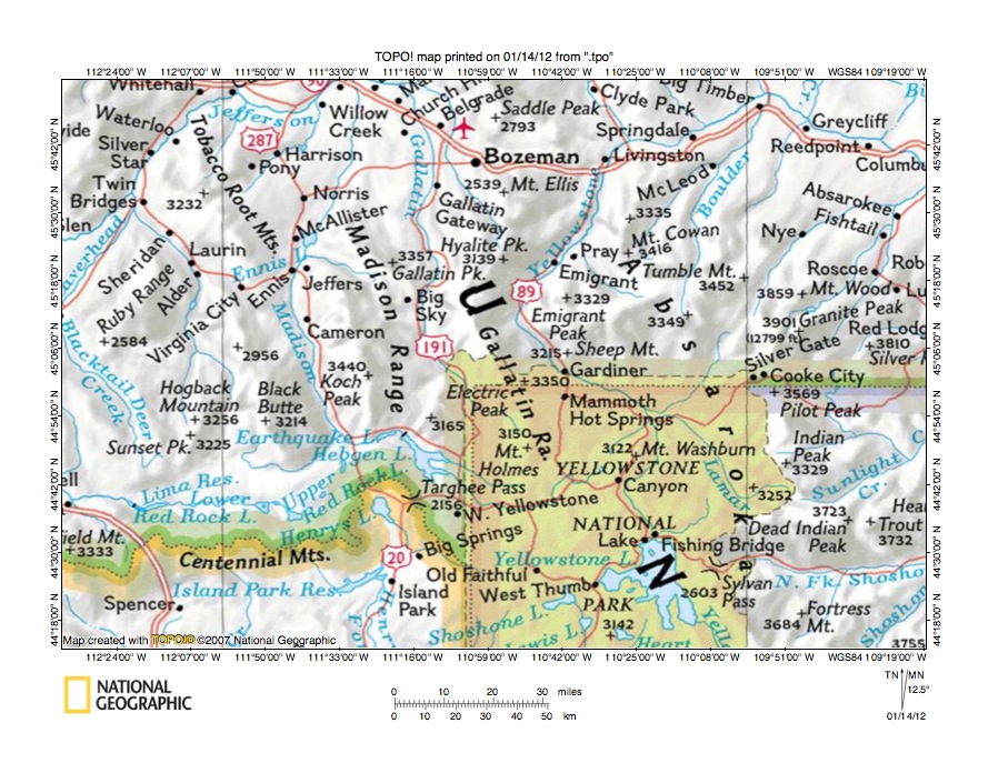 Figure 3: Yellowstone River-Yellowstone River drainage divide area north of Yellowstone National Park. United States Geological Survey map digitally presented using National Geographic Society TOPO software.