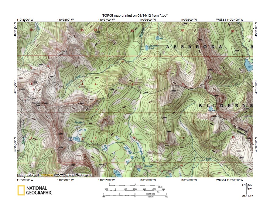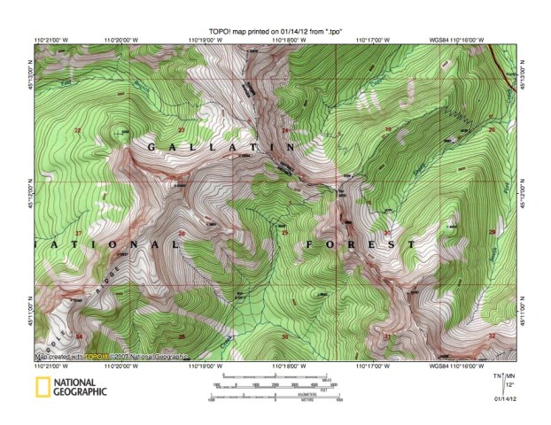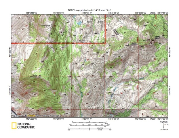 Figure 10: Detailed map of Copper Creek-Middle Fork Hellroaring Creek drainage divide area. United States Geological Survey map digitally presented using National Geographic Society TOPO software.