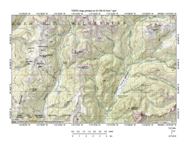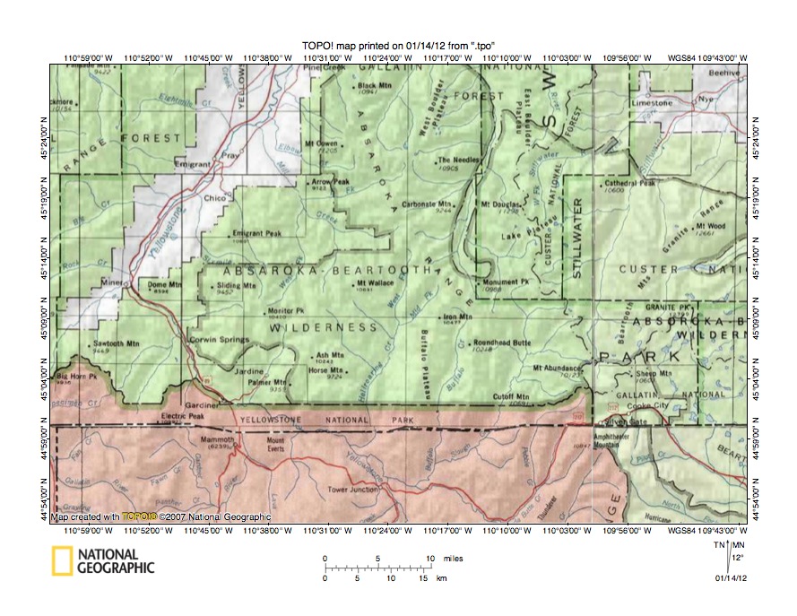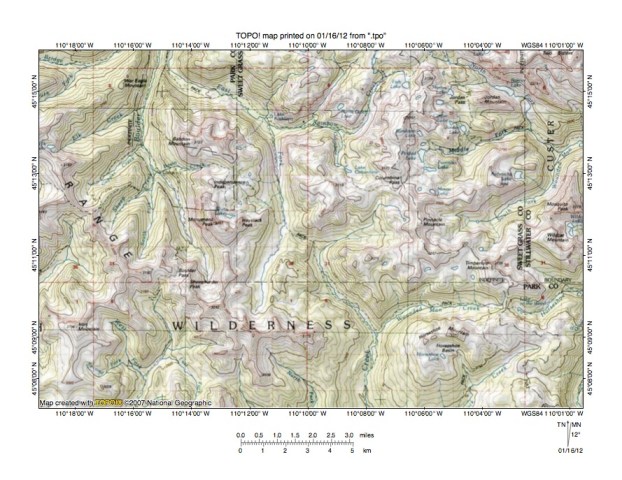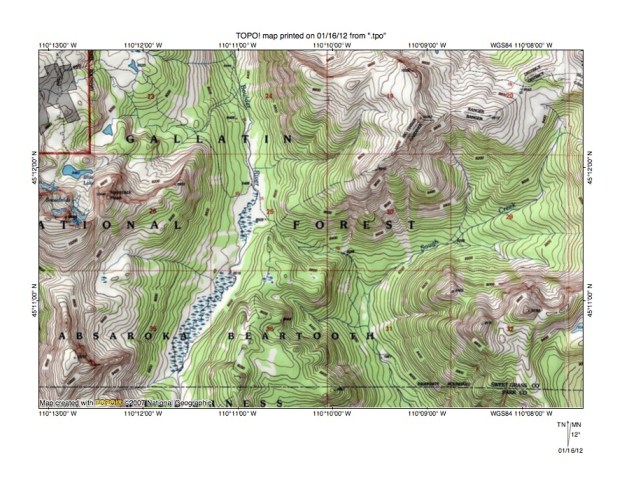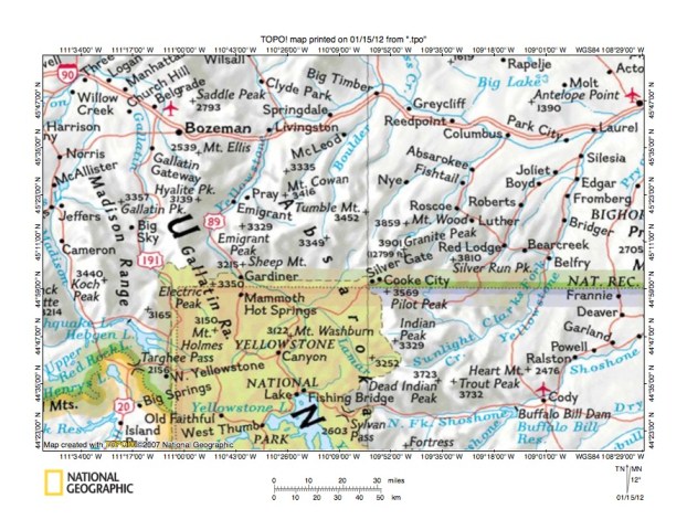 Figure 3: Boulder River-Hellroaring Creek drainage divide area north of Yellowstone National Park. United States Geological Survey map digitally presented using National Geographic Society TOPO software.