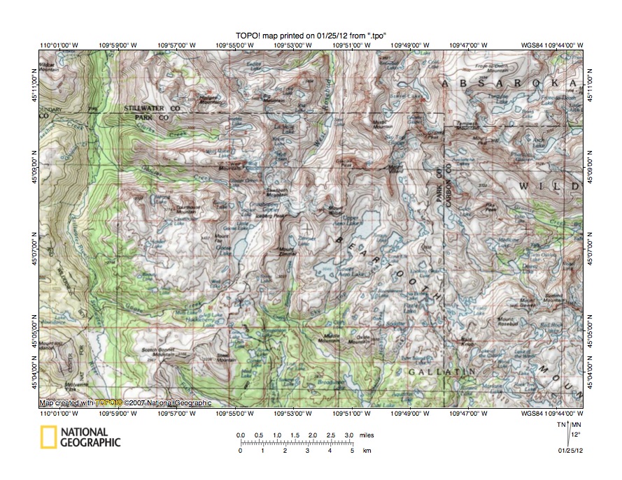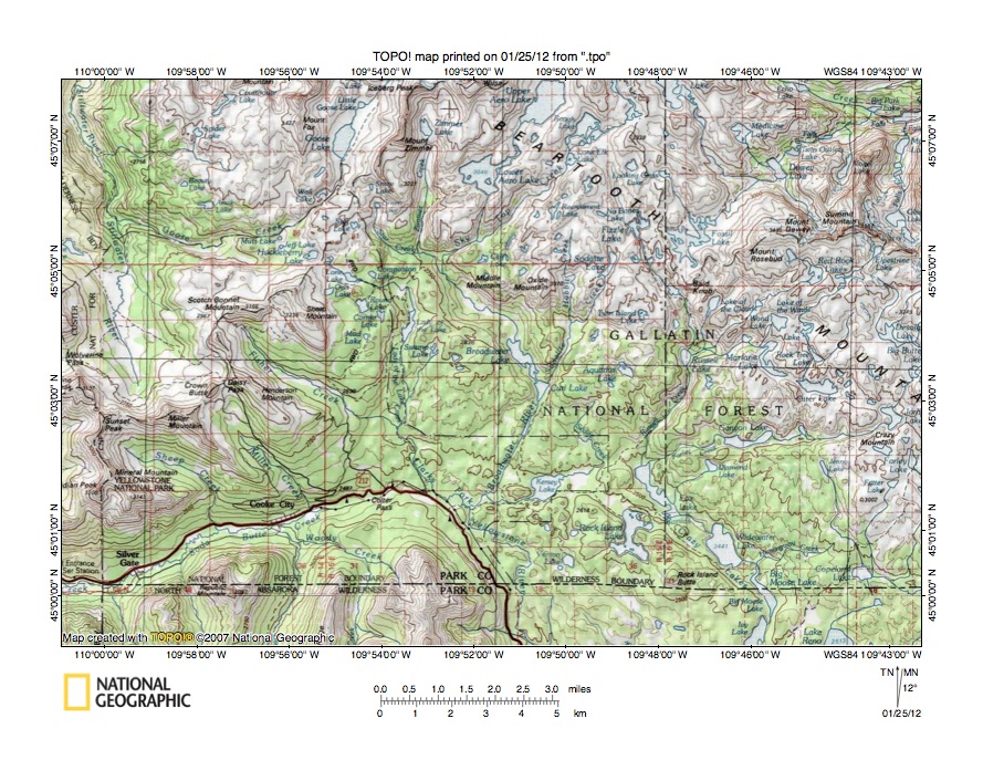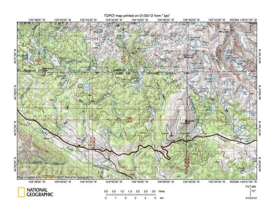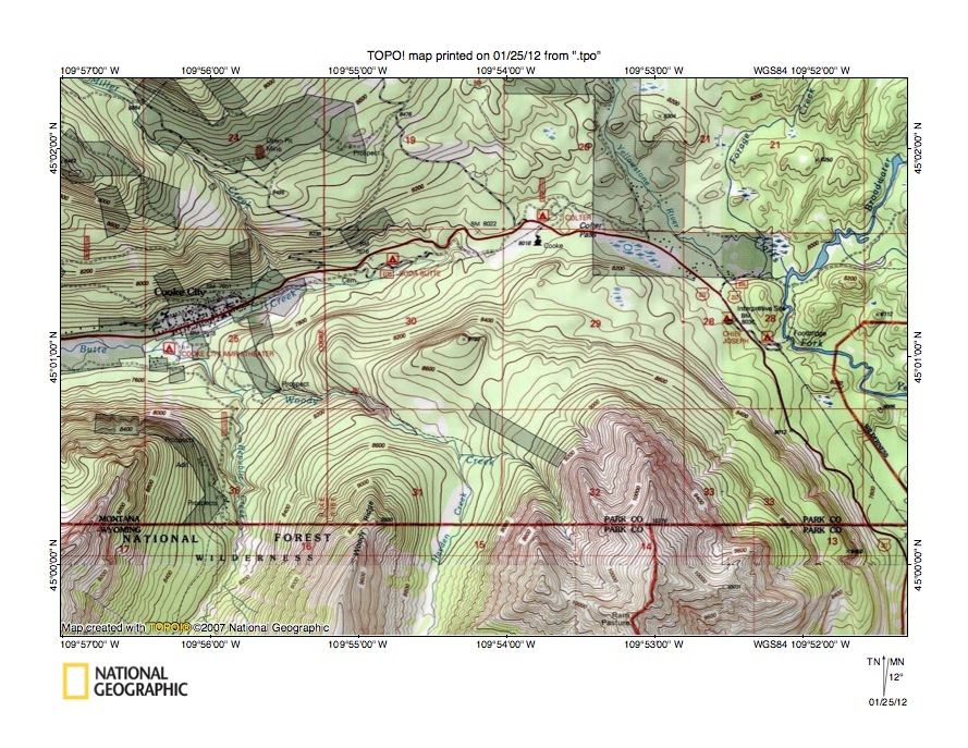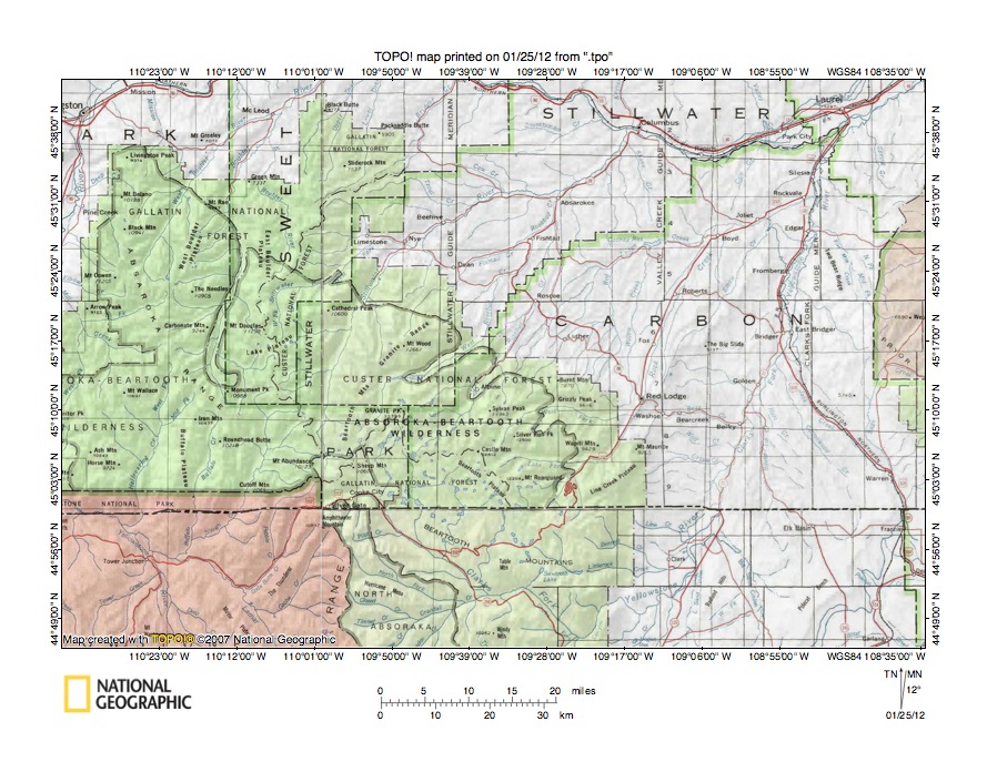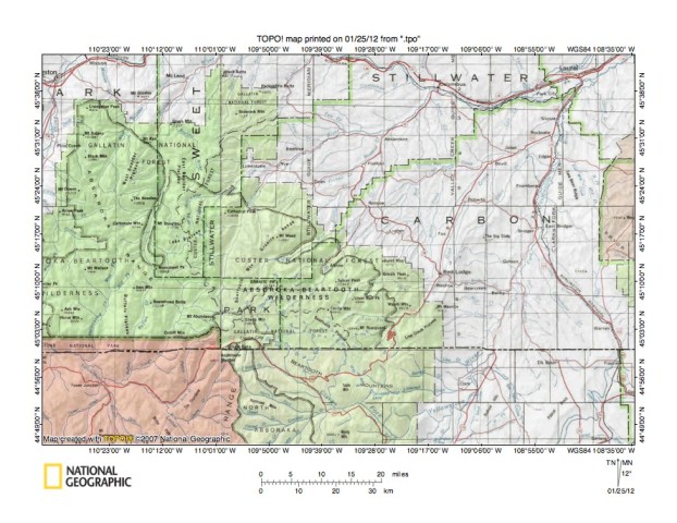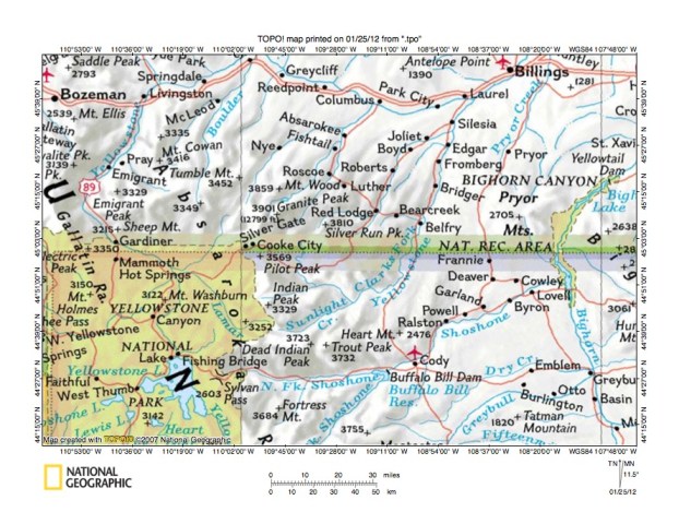 Figure 1: Rosebud Creek-Clarks Fork of the Yellowstone River drainage divide area location map (select and click on maps to enlarge). National Geographic Society map digitally presented using National Geographic Society TOPO software.