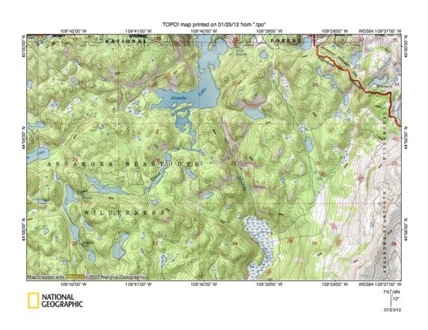 Figure 6: Detailed map of West Rosebud Creek-Zimmer Creek drainage divide area. United States Geological Survey map digitally presented using National Geographic Society TOPO software.