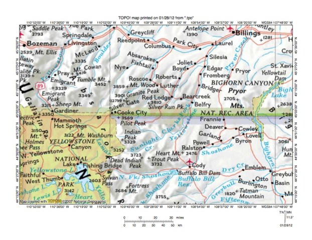 Figure 1: Rock Creek-Clarks Fork of the Yellowstone River drainage divide area location map (select and click on maps to enlarge). National Geographic Society map digitally presented using National Geographic Society TOPO software.