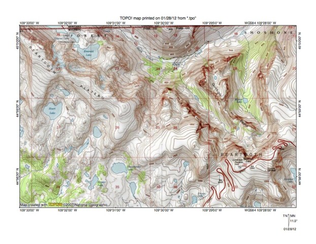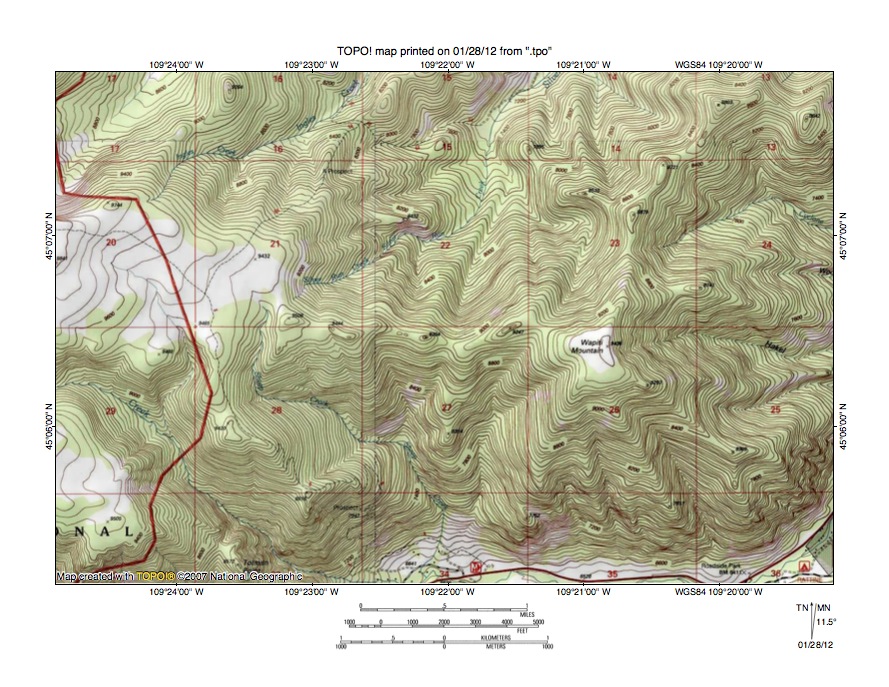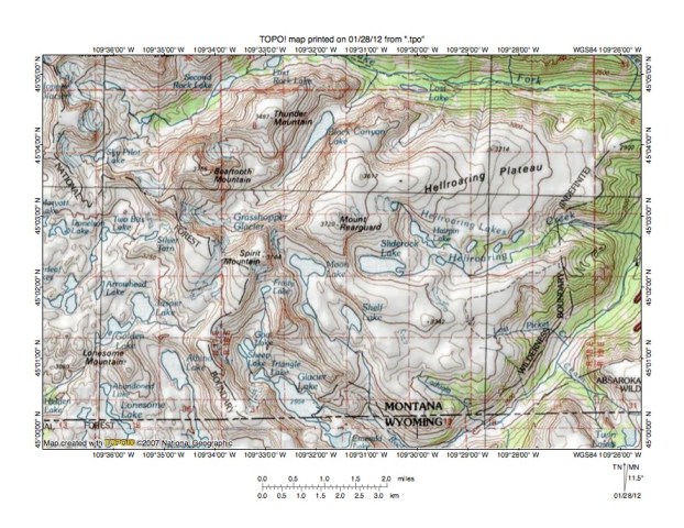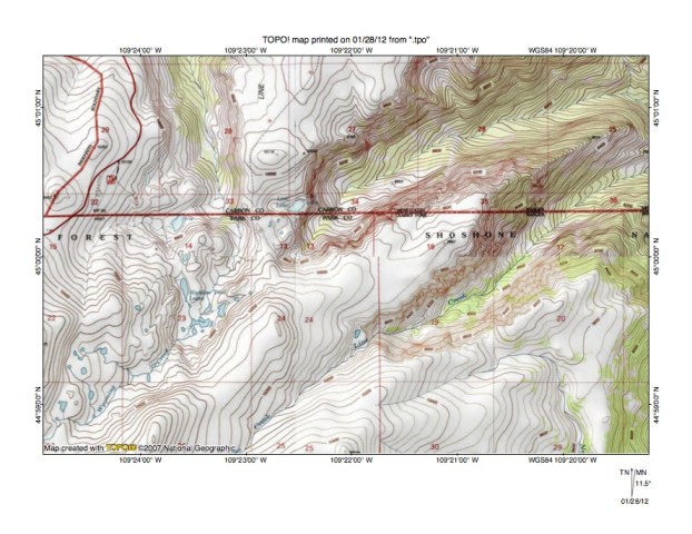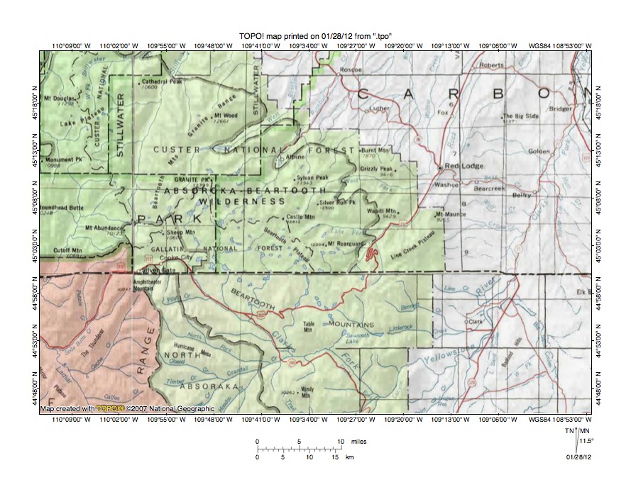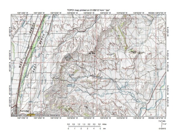 Figure 3: Rock Creek-Clarks Fork of the Yellowstone River drainage divide area north of Red Lodge, Montana. United States Geological Survey map digitally presented using National Geographic Society TOPO software.