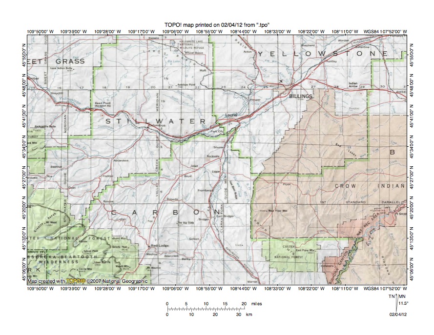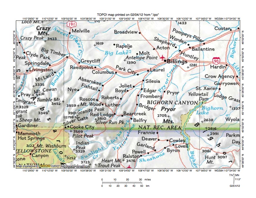 Figure 1: Clarks Fork of the Yellowstone River-Pryor Creek drainage divide area location map (select and click on maps to enlarge). National Geographic Society map digitally presented using National Geographic Society TOPO software.