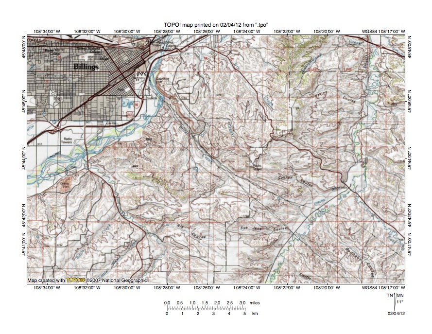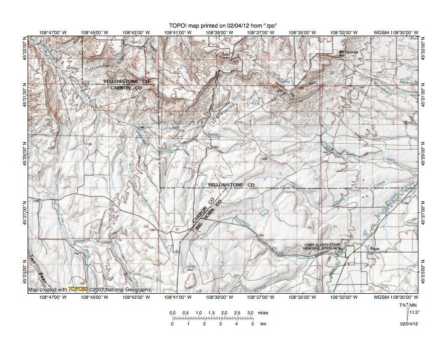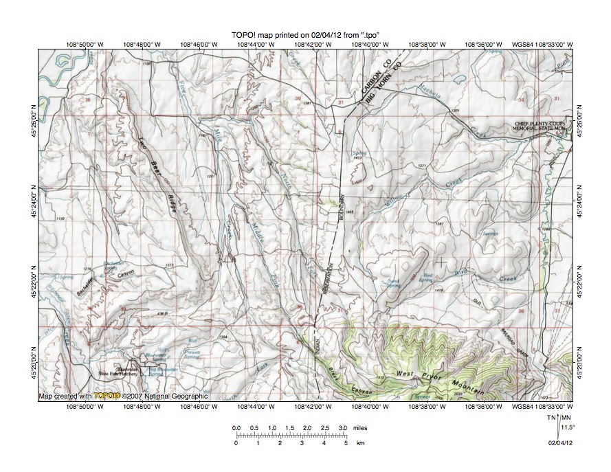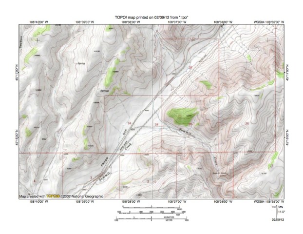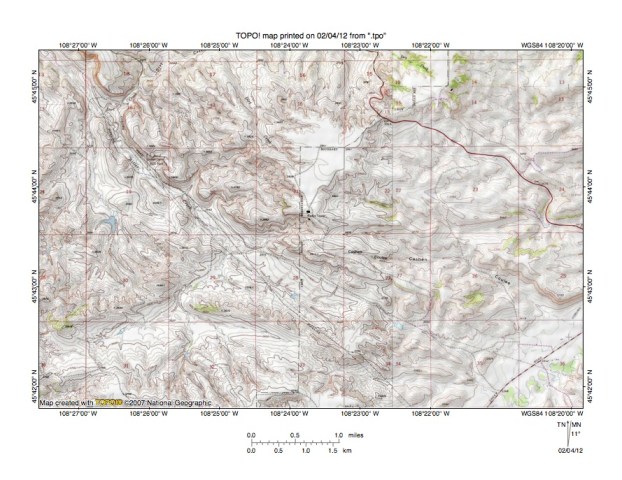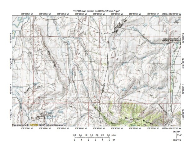 Figure 3: Yellowstone River-Pryor Creek drainage divide area. United States Geological Survey map digitally presented using National Geographic Society TOPO software.
