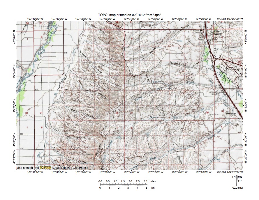 Figure 7: Lodge Grass Creek-Little Bighorn River drainage divide area. United States Geological Survey map digitally presented using National Geographic Society TOPO software.