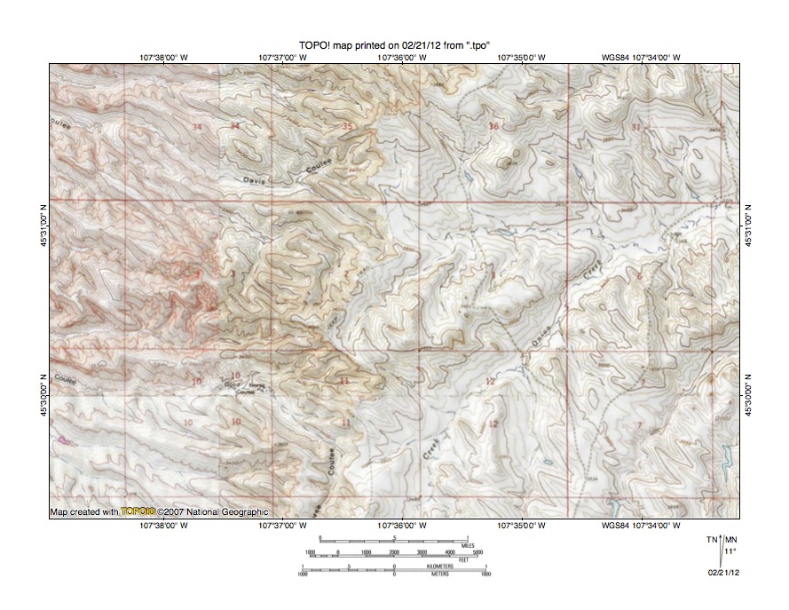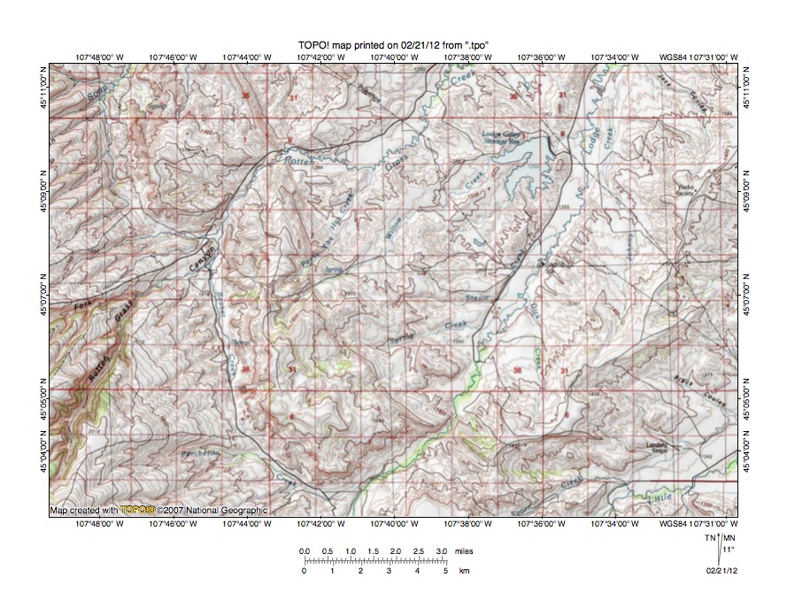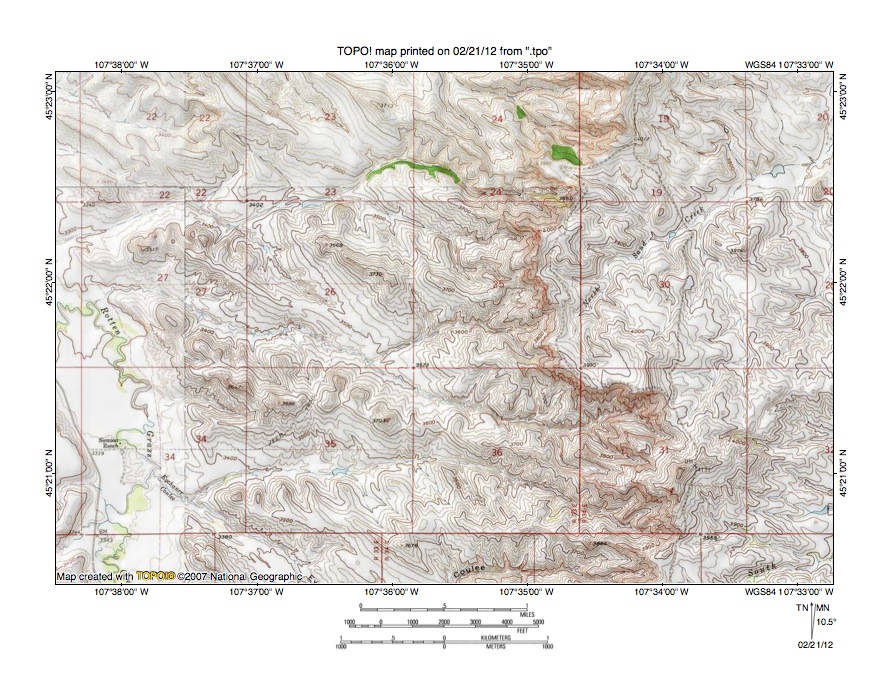Figure 8: Rotten Grass Creek-Lodge Grass Creek drainage divide area. United States Geological Survey map digitally presented using National Geographic Society TOPO software.