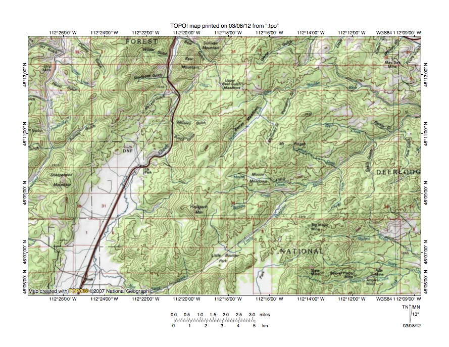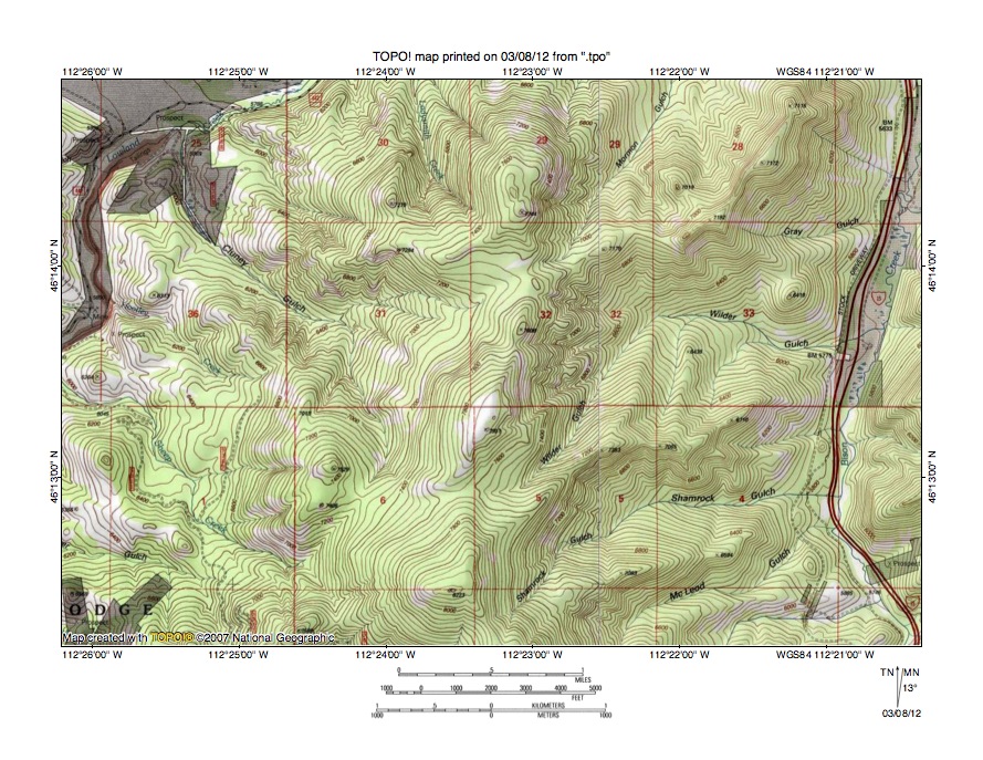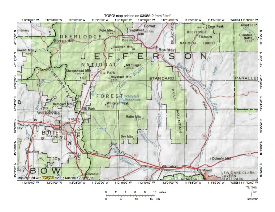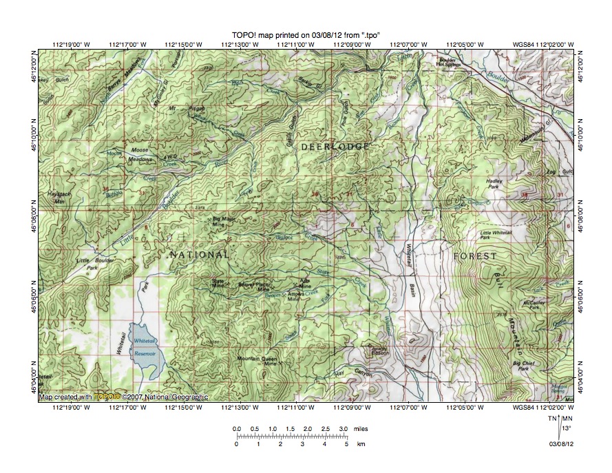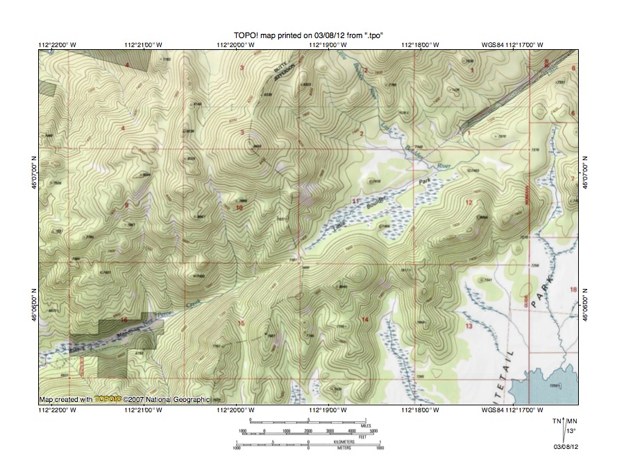 Figure 8: Detailed map of Little Boulder River-Whitetail Creek drainage divide area. United States Geological Survey map digitally presented using National Geographic Society TOPO software.