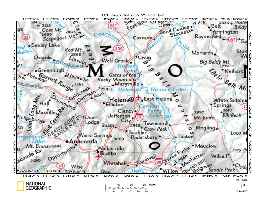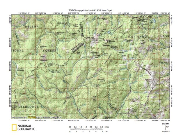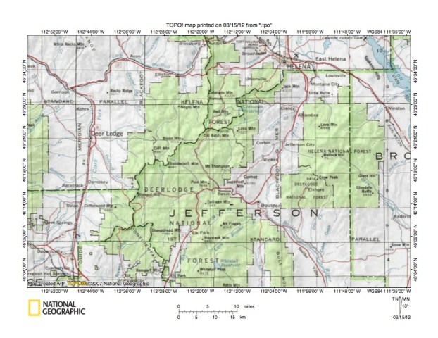 Figure 1: Little Blackfoot River-Boulder River drainage divide area location map (select and click on maps to enlarge). National Geographic Society map digitally presented using National Geographic Society TOPO software.