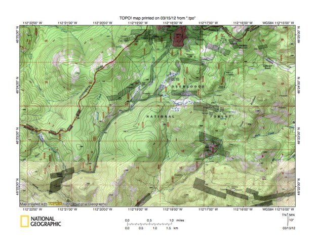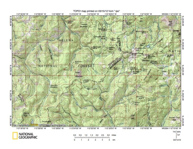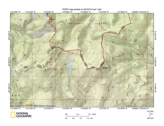 Figure 6: Detailed map of Little Blackfoot River-South Fork Basin Creek drainage divide area. United States Geological Survey map digitally presented using National Geographic Society TOPO software.