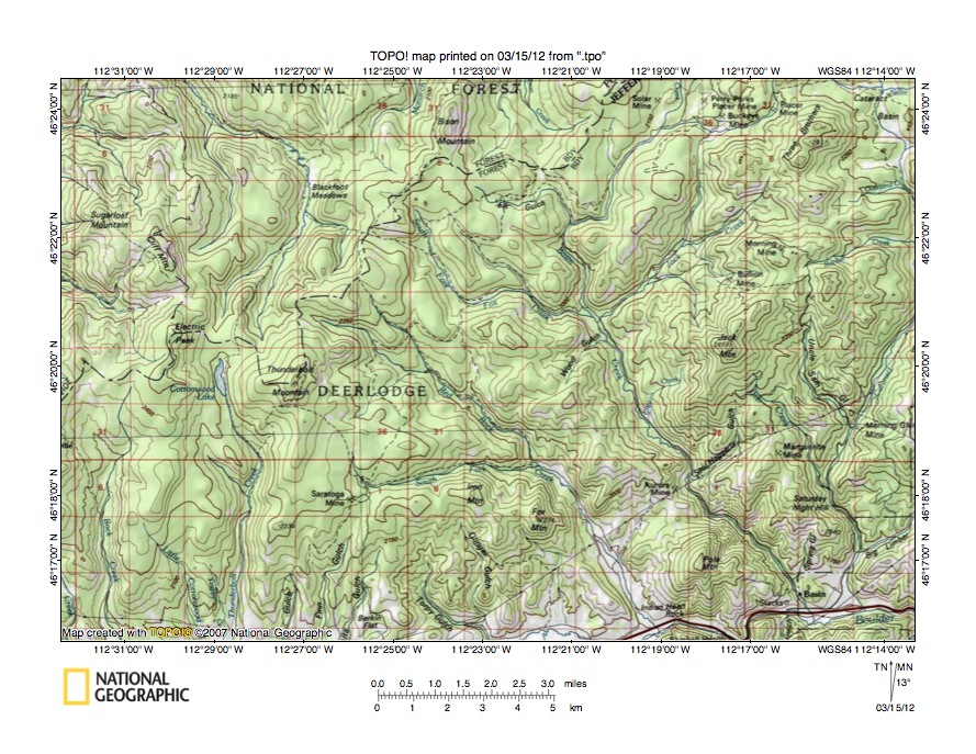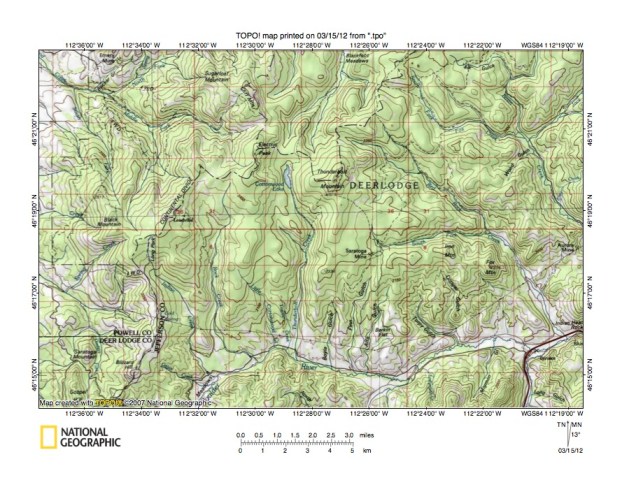 Figure 5: Little Blackfoot River-Basin Creek drainage divide area. United States Geological Survey map digitally presented using National Geographic Society TOPO software.