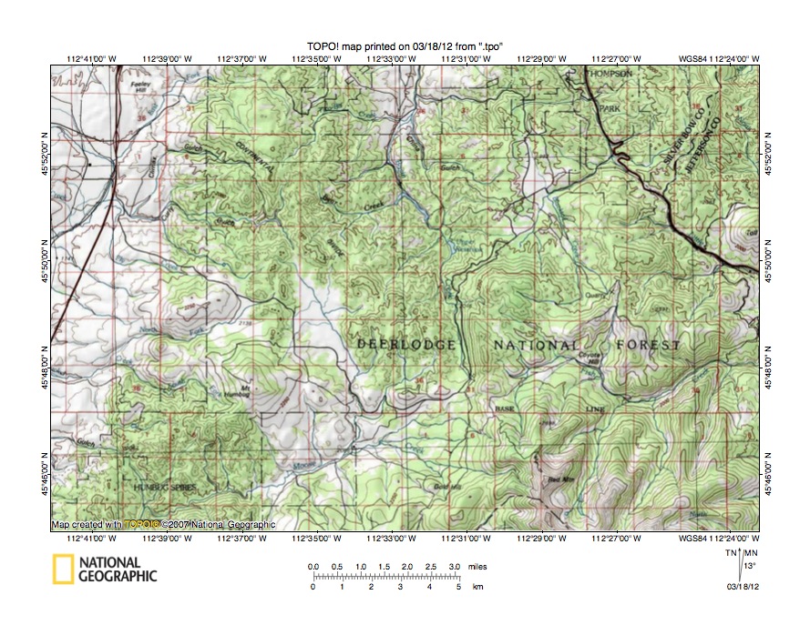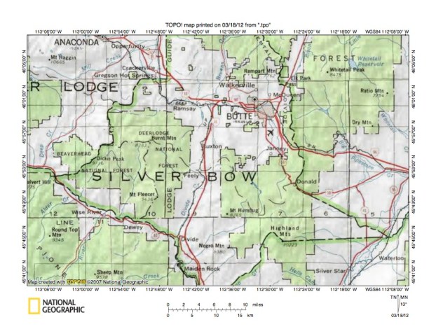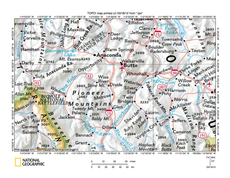 Figure 1: Silver Bow Creek-Big Hole River drainage divide area location map (select and click on maps to enlarge). National Geographic Society map digitally presented using National Geographic Society TOPO software.