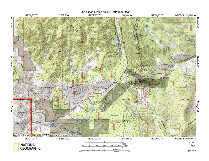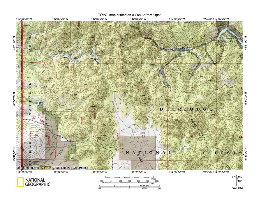 Figure 6: Detailed map of Bear Gulch-North Fork Moose Creek drainage divide area. United States Geological Survey map digitally presented using National Geographic Society TOPO software.