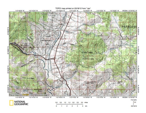 Figure 5: Bear Gulch-Moose Creek drainage divide area. United States Geological Survey map digitally presented using National Geographic Society TOPO software.