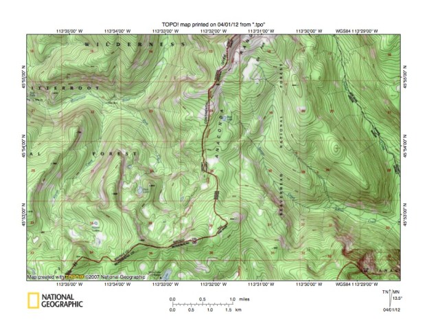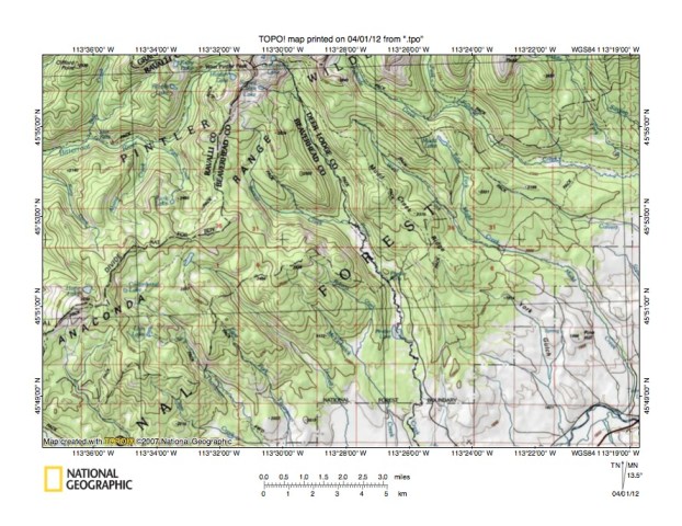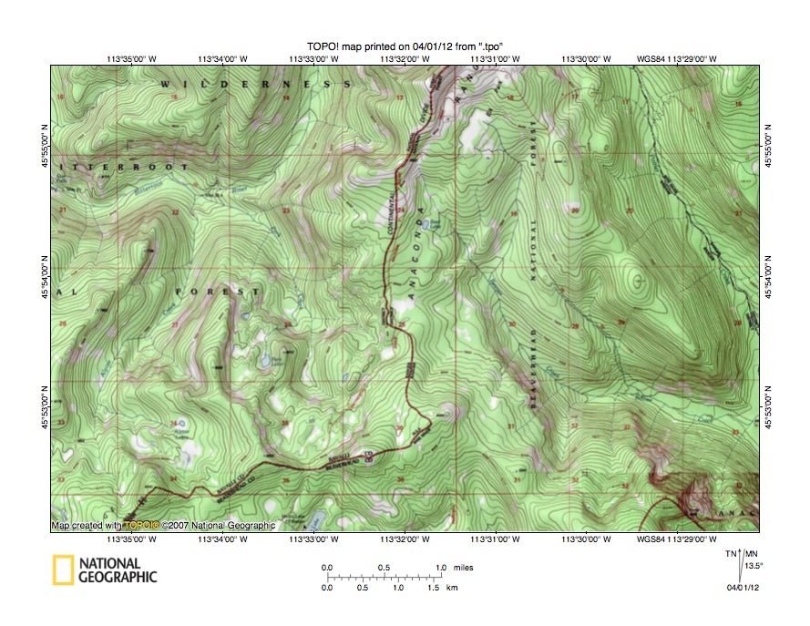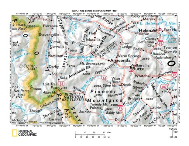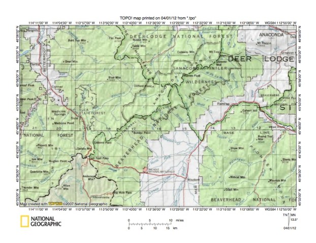 Figure 1: East Fork Bitterroot River-Big Hole River drainage divide area location map (select and click on maps to enlarge). National Geographic Society map digitally presented using National Geographic Society TOPO software.