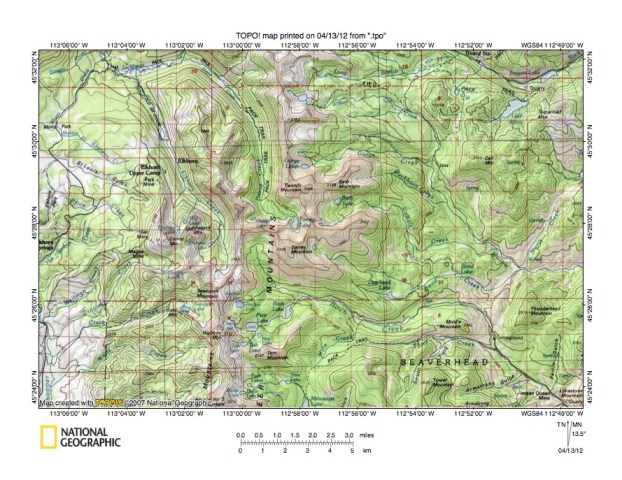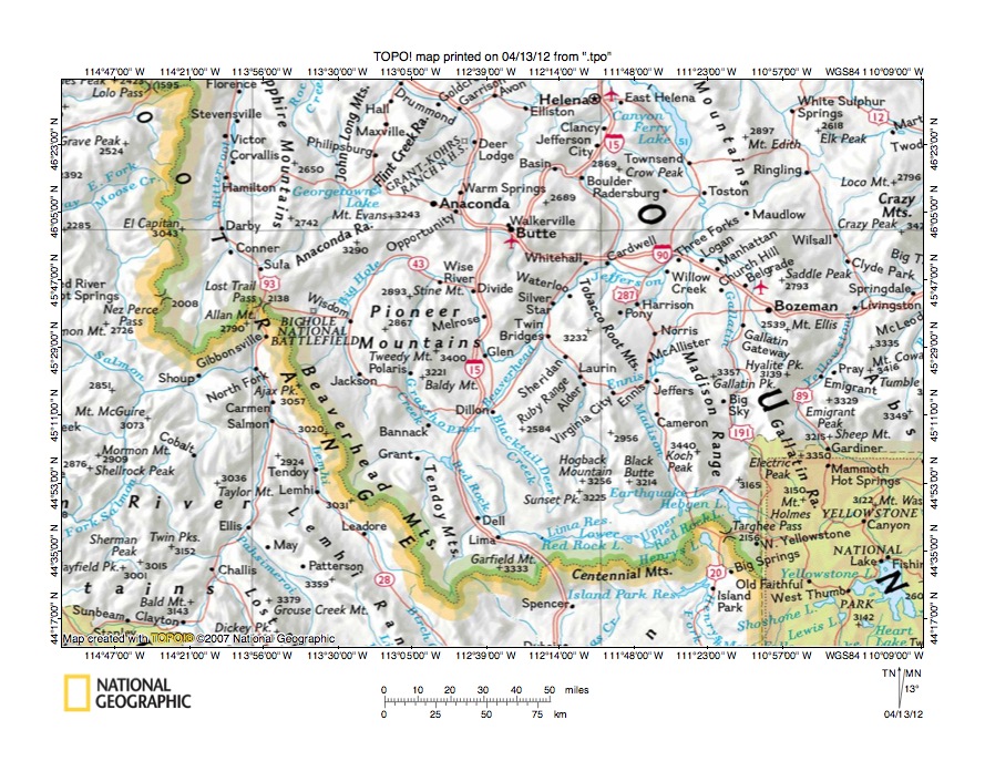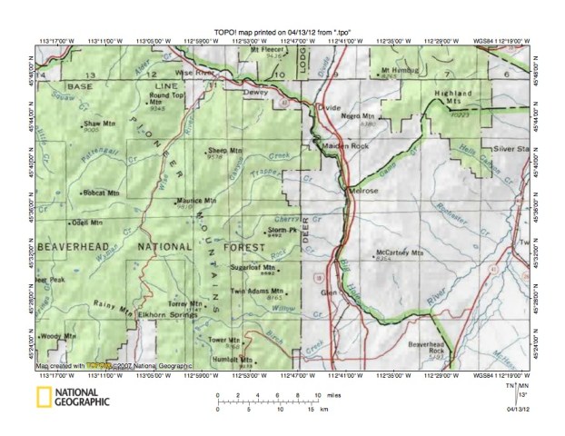 Figure 1: Wise River-Big Hole River drainage divide area location map (select and click on maps to enlarge). National Geographic Society map digitally presented using National Geographic Society TOPO software.