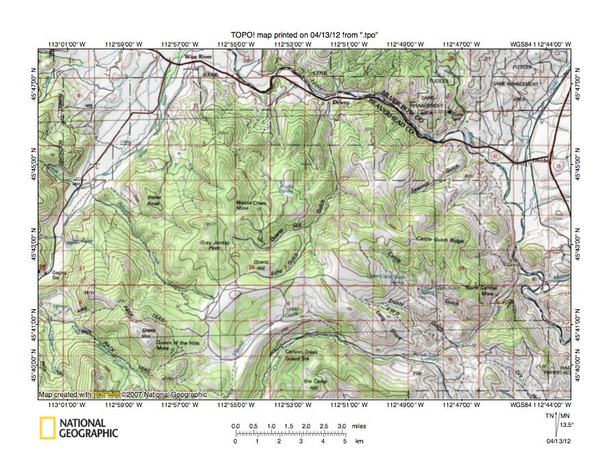Figure 3: Wise River-Canyon Creek drainage divide area. United States Geological Survey map digitally presented using National Geographic Society TOPO software.