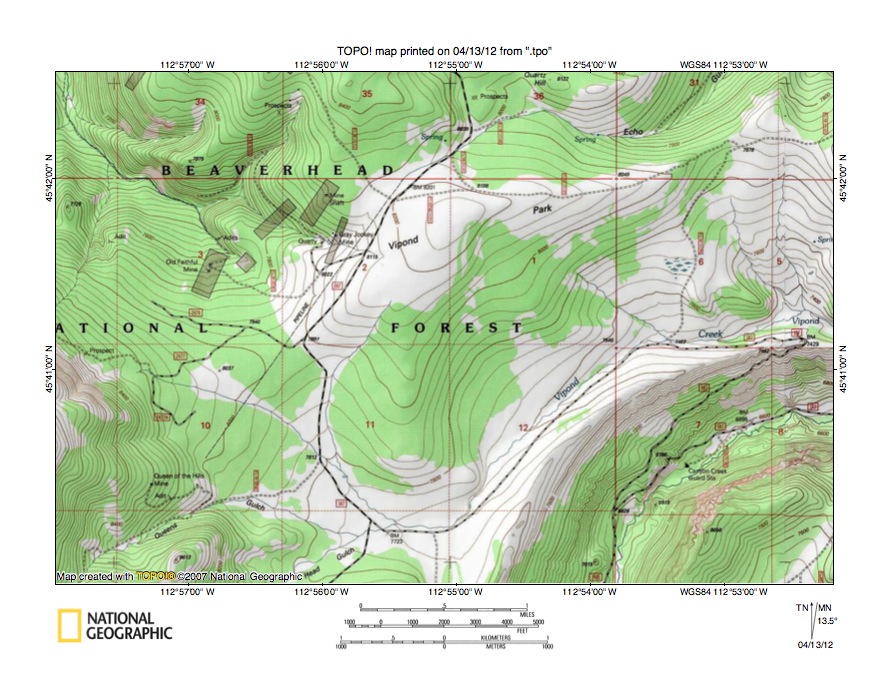 Figure 4: Detailed map of Adson Creek-Vipond Creek drainage divide area. United States Geological Survey map digitally presented using National Geographic Society TOPO software.
