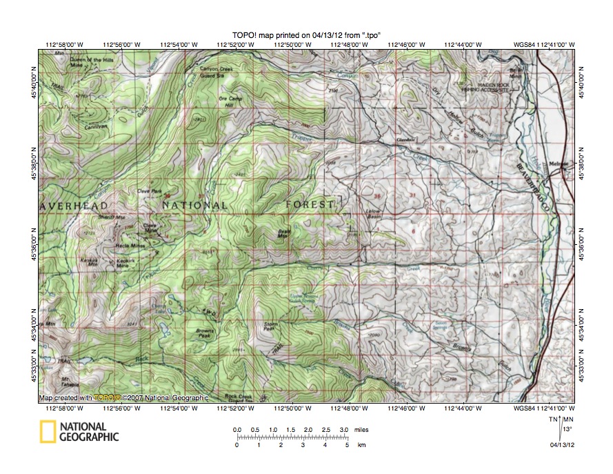 Figure 5: Canyon Creek-Big Hole River drainage divide area. United States Geological Survey map digitally presented using National Geographic Society TOPO software.