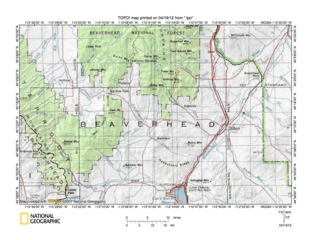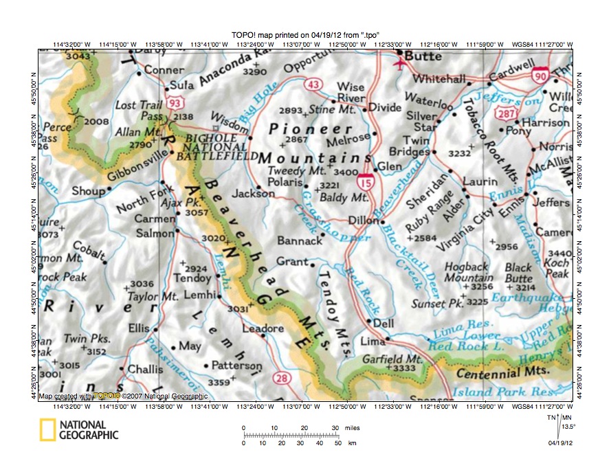 Figure 1: Big Hole River-Beaverhead River drainage divide area location map (select and click on maps to enlarge). National Geographic Society map digitally presented using National Geographic Society TOPO software.