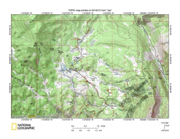 Figure 8: Detailed map of Fox Creek-Brays Canyon Creek drainage divide area. United States Geological Survey map digitally presented using National Geographic Society TOPO software.