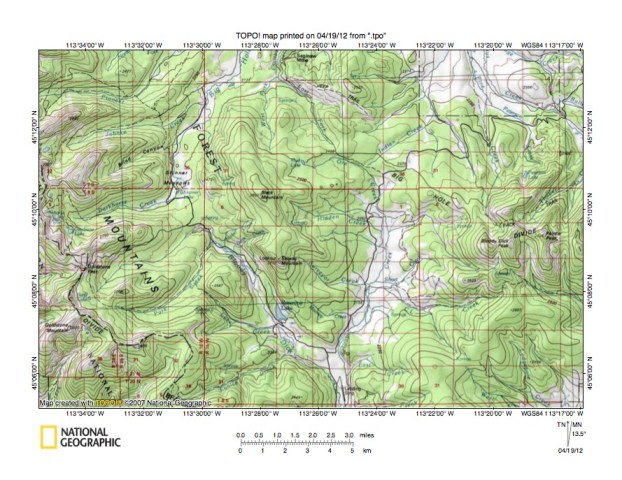 Figure 5: Bull Creek-Grasshopper Creek drainage divide area. United States Geological Survey map digitally presented using National Geographic Society TOPO software.