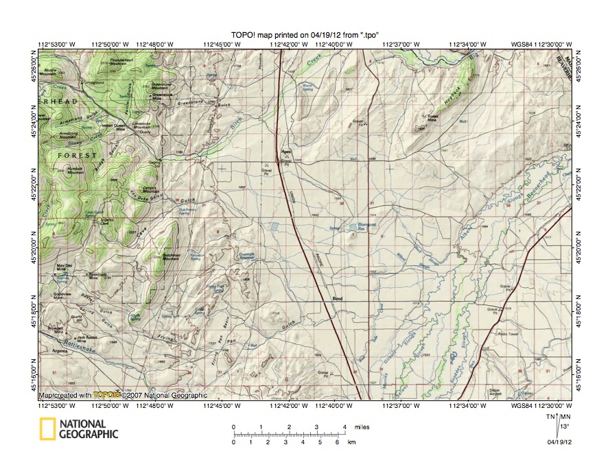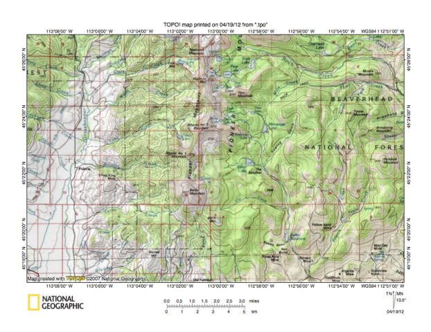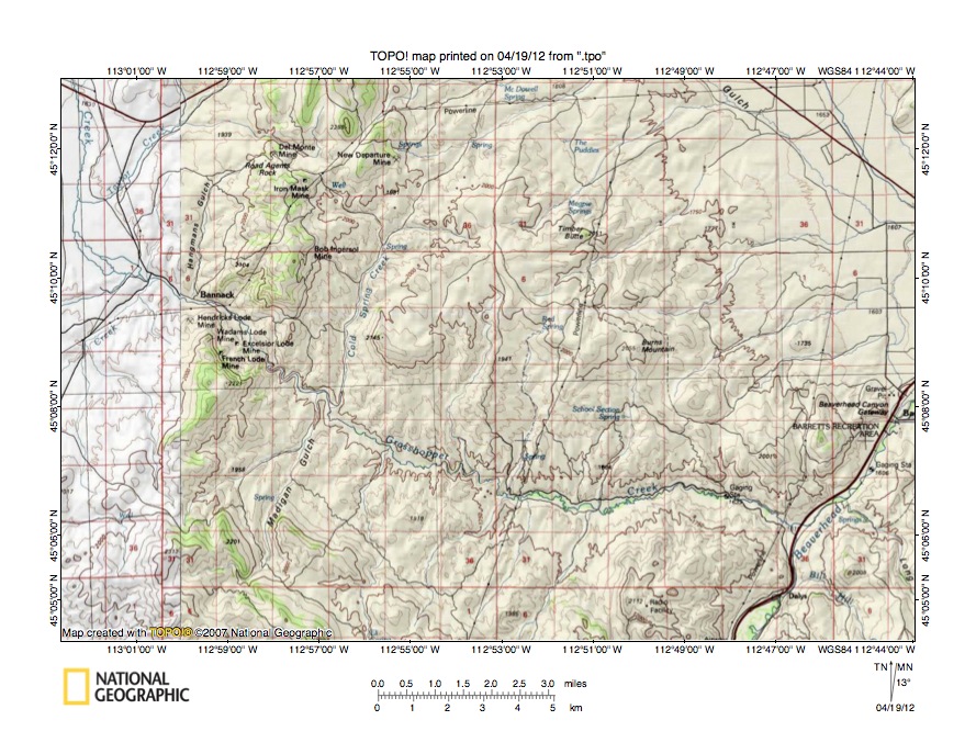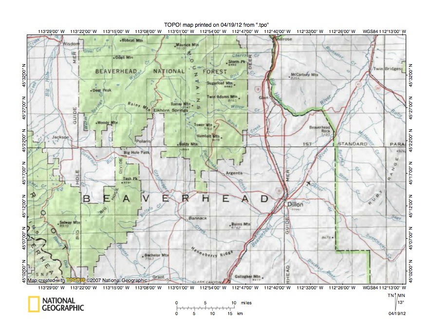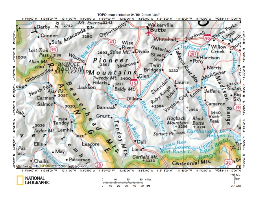 Figure 1: Grasshopper Creek-Beaverhead River drainage divide area location map (select and click on maps to enlarge). National Geographic Society map digitally presented using National Geographic Society TOPO software.