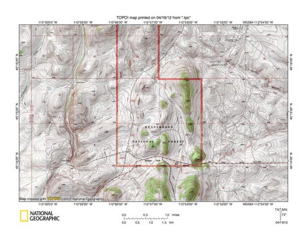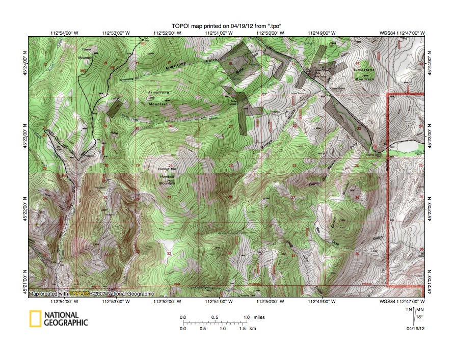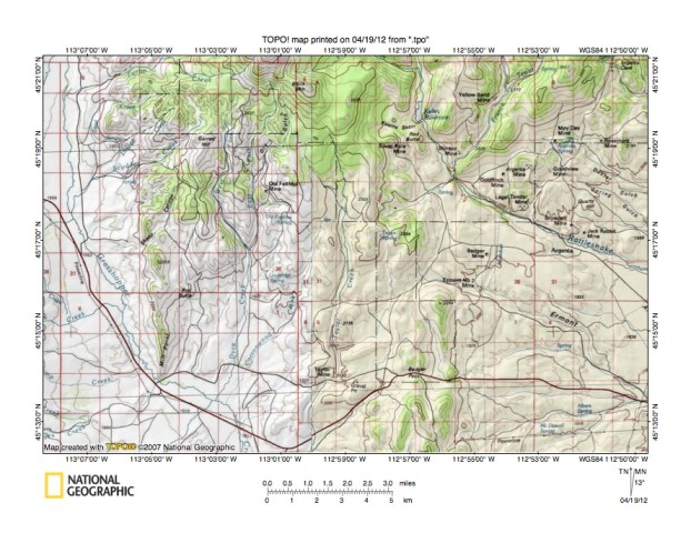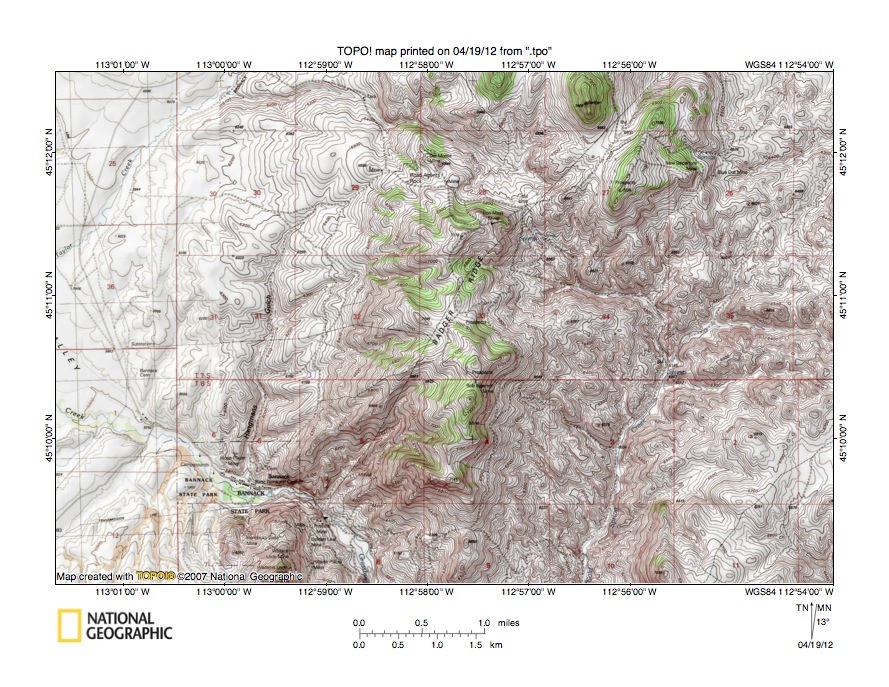 Figure 3: Grasshopper Creek-Rattlesnake Creek drainage divide area. United States Geological Survey map digitally presented using National Geographic Society TOPO software.